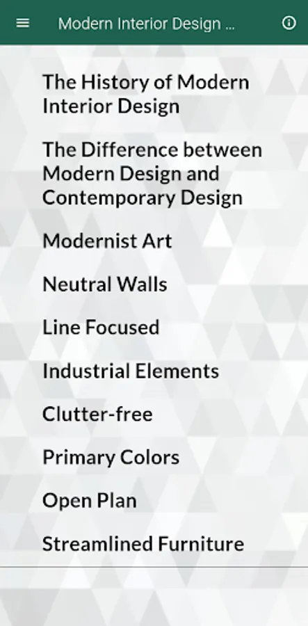 Modern interior design is shaped by a heritage of clean lines, geometric form, clear spaces, function and storage. In our app interior design we explore some of the concepts behind modern design style, how to distinguish each approach and how to create the look in your own home.