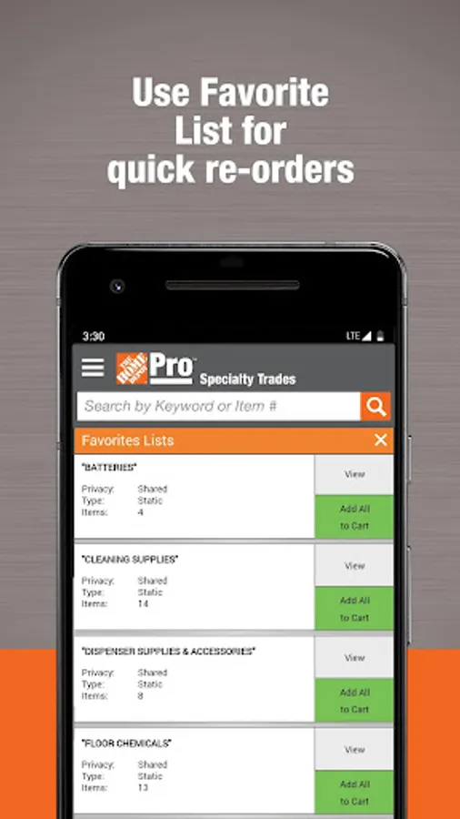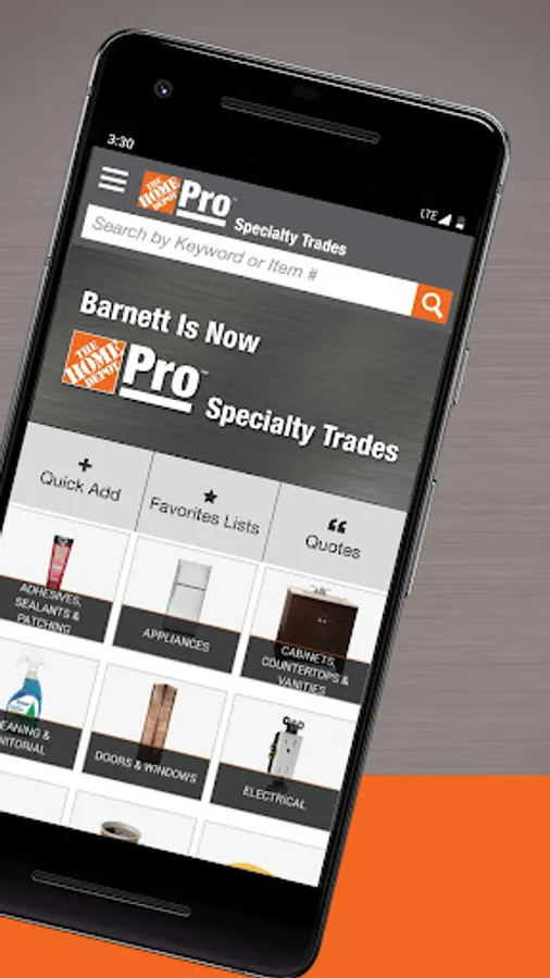 The Home Depot Pro Specialty Trades app lets you purchase items from your saved favorites list or customized product offering, as well as create, manage and approve quotes on the go.