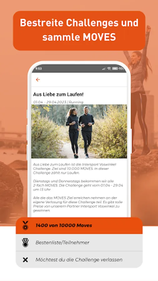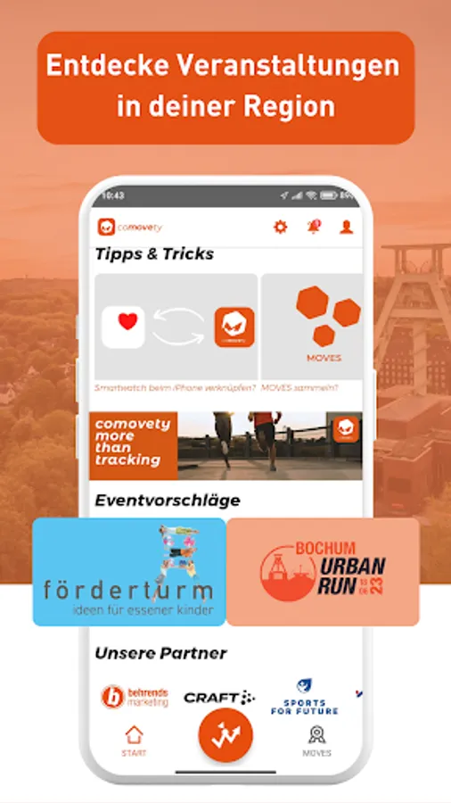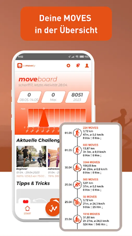 With every movement you collect points - our MOVES. Our challenge goals are easy to reach, giving you the chance to win exclusive prizes in no time. It is sufficient if you track your everyday movement, e.g. the way to the baker or the hairdresser. Your MOVES are displayed in the Moveboard and you can see how active you were today, this week, this month or this year. Motivate yourself through our community and through our national/local challenges. Choose the right one for you and get the prices of our partners.