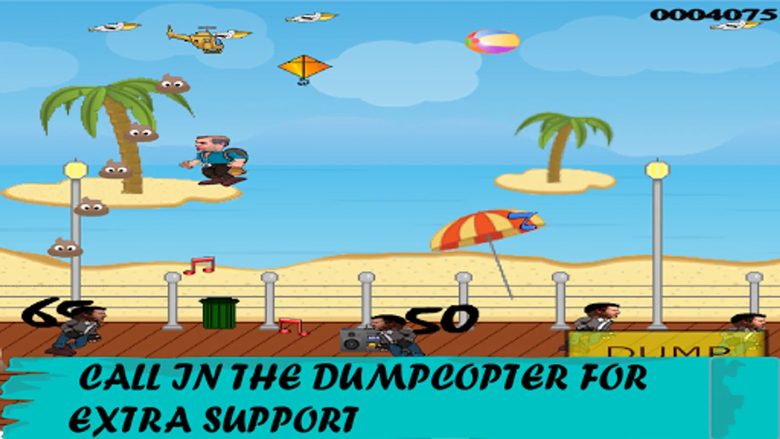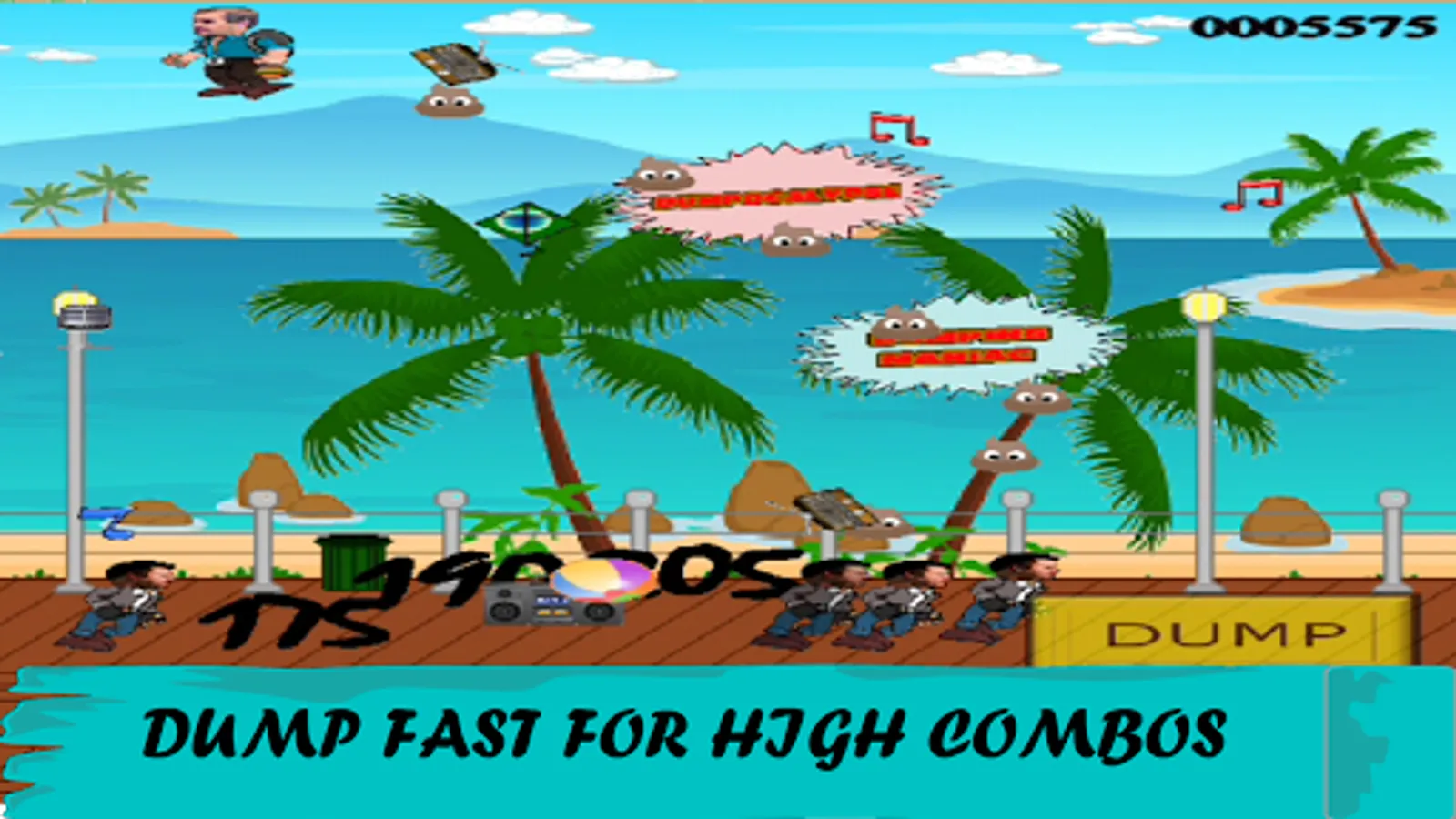 Keep calm, dump away, and land combo's to boost your score even higher. Tap the 'Dump' button to perform an attack. Collect 3 microphones to call upon the dumpcopter. Find out how high a score you can achieve. Beware, once you collide with something it's game over!