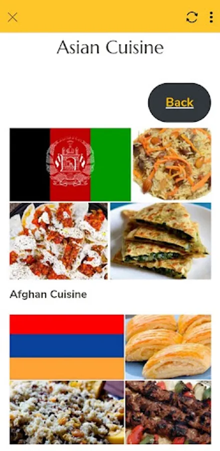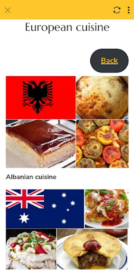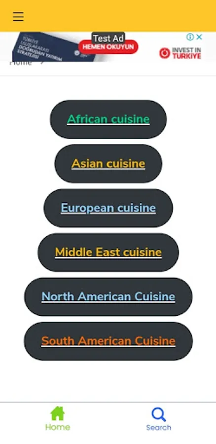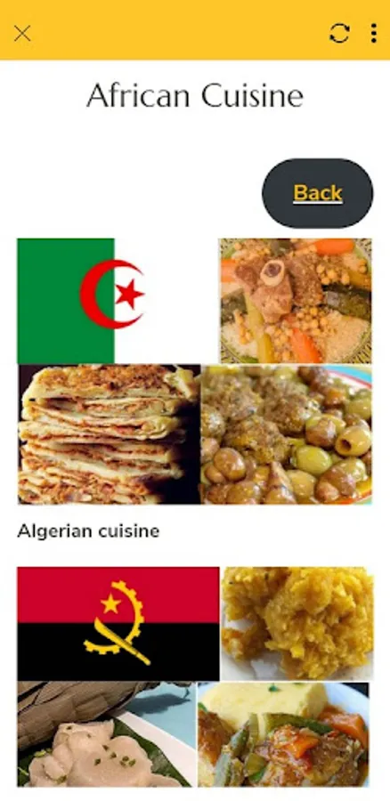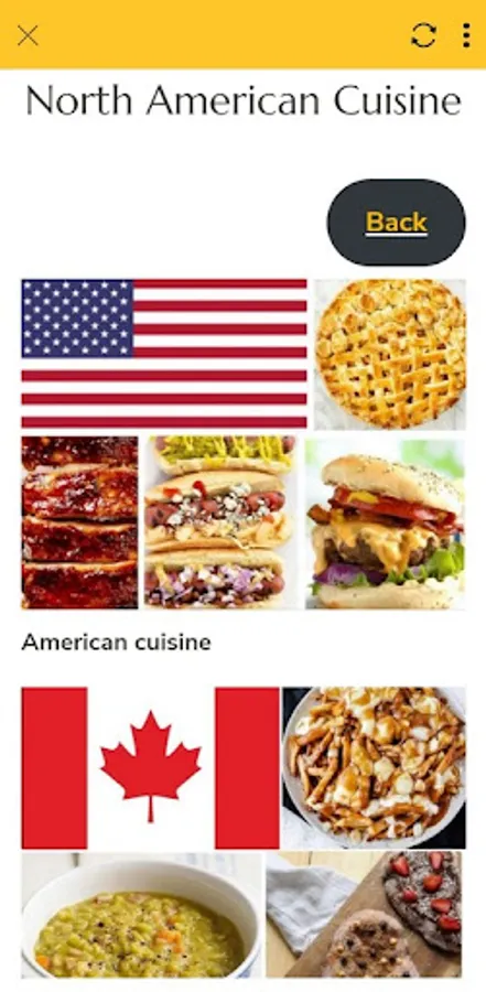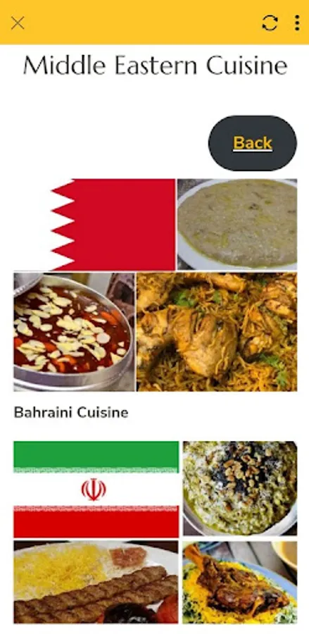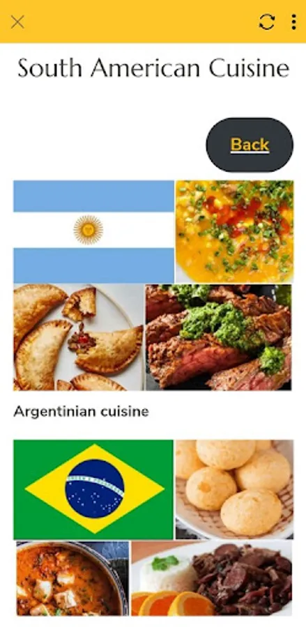 The app offers food recipes that are mainly classified into six sections : Asian cuisine, European cuisine, Middle Eastern cuisine, African cuisine, North American cuisine, South American cuisine) and each section contains lists of favorite foods in the country that belongs to this division.