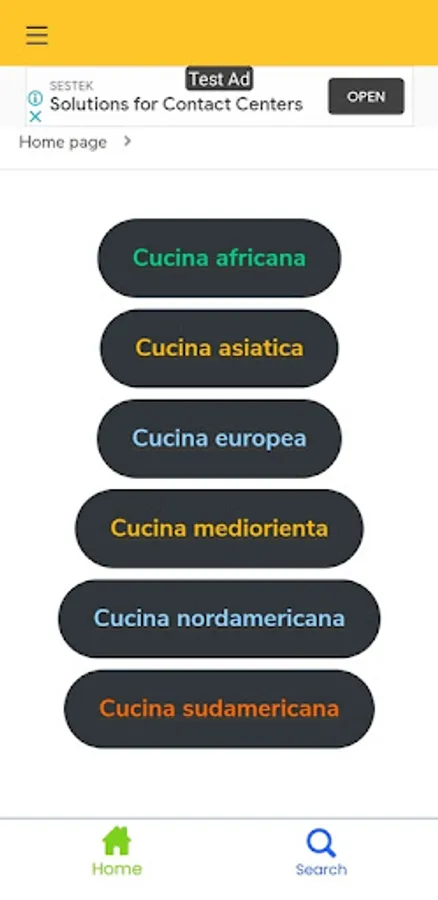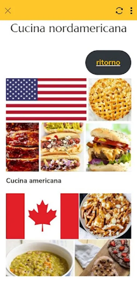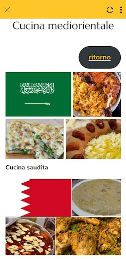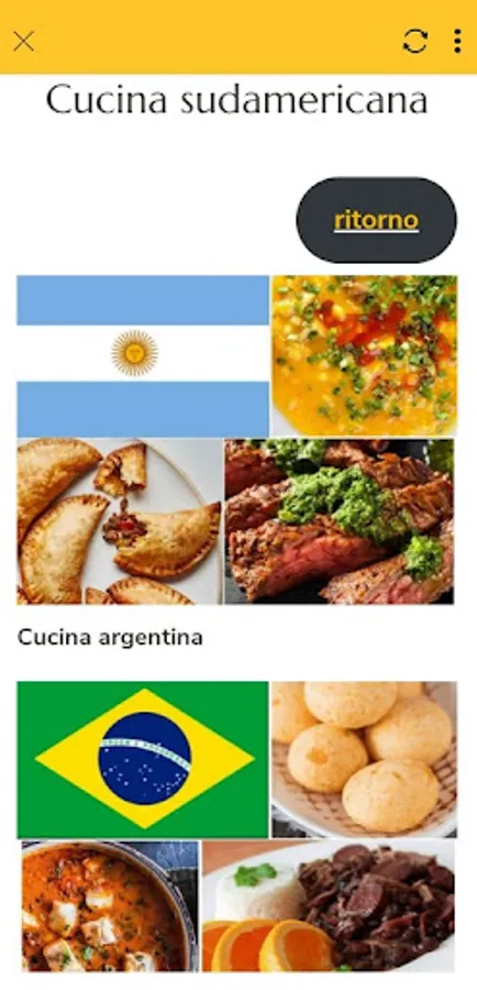 The app offers food recipes which are mainly classified into six sections: Asian Cuisine, European Cuisine, Middle Eastern Cuisine, African Cuisine, North American Cuisine, South American Cuisine) and each section contains lists of favorite foods in the country that belongs to this division.