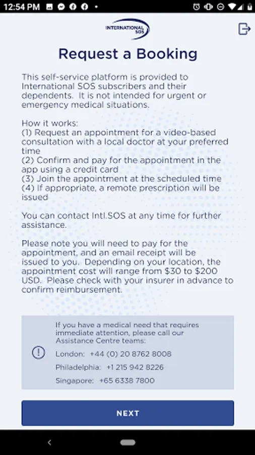The International SOS Self-Service TeleConsultation App enables Intl.SOS subscribers to directly request, pay for, and participate in a video-based outpatient appointment with a locally licensed, credentialled doctor. This Beta version is made available exclusively to those who have been invited to participate in the pilot trial launch.