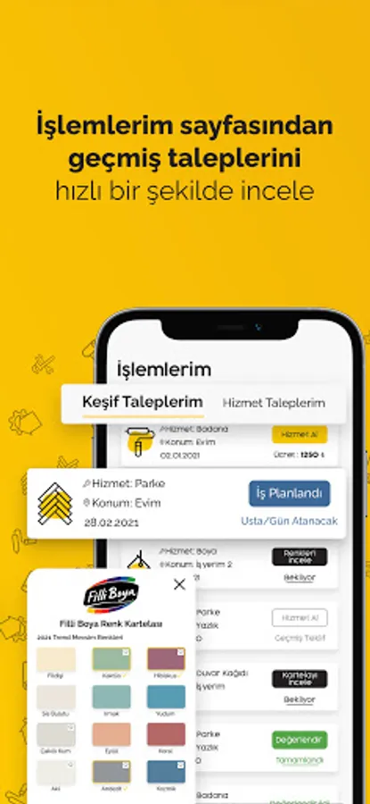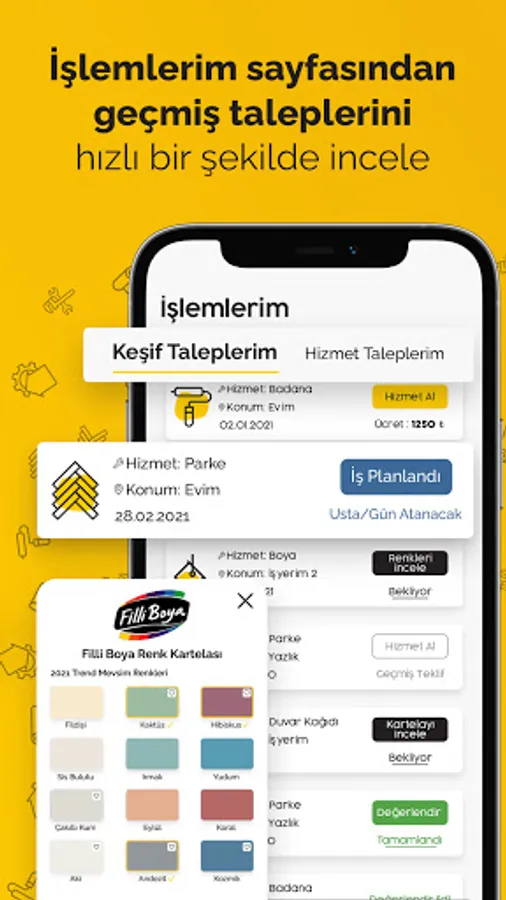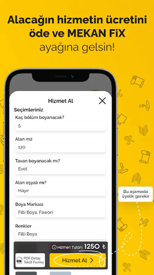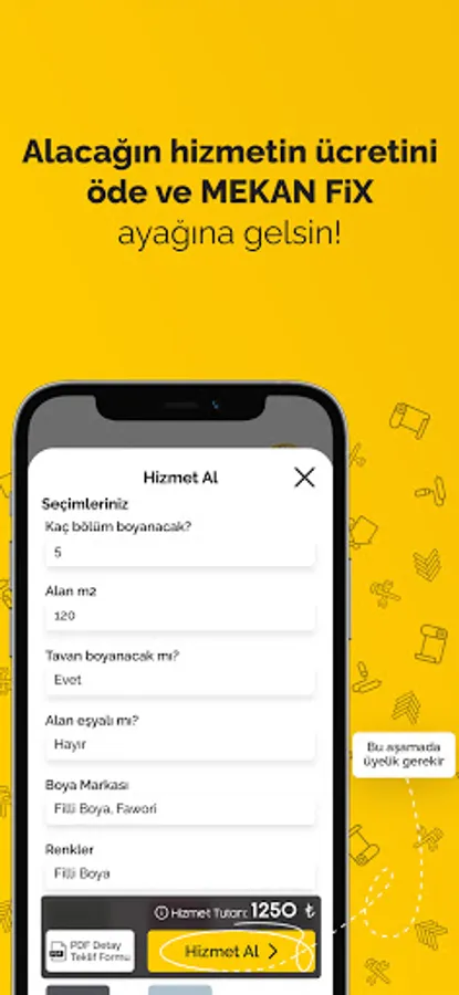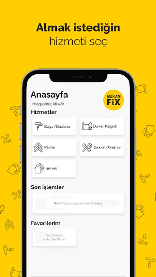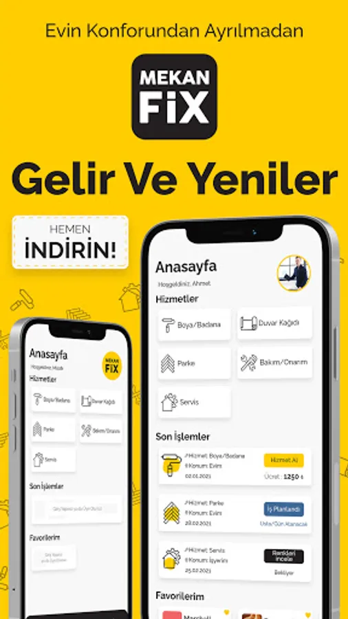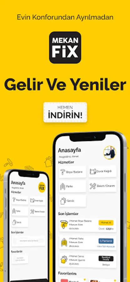 MEKAN FiX evinizde yenileme, bakım, onarım, servis ihtiyacı olan konularda sizi evden dışarı adım atmadan en iyi ürün ve hizmet kalitesi ile buluşturmak için kurulmuş bir hizmet merkezidir. Boya-badana, Parke, Duvar Kağıdı uygulamaları gibi yenileme çözümleri sunar. Bunun yanında Tesisat, Radyatör, Petek, Elektrik gibi bakım onarım ile Klima, Kombi, Beyaz Eşya gibi servis ihtiyaçlarınıza da servis sağlar.MEKAN FiX Usta ProgramıSizin için belirlediğimiz hizmet standartlarını sağlayacak ustaları programa kabul ediyoruz. Bunun için ustalara temizlik, hijyen, giyim, iletişim ve sundukları hizmet kalitesi ile ilgili eğitimler veriyoruz. Bu eğitimler sonucunda hedeflenen kaliteye ulaşan ustalar programa dahil edilir.Sistem Nasıl Çalışır?Uygulama üzerinden ihtiyacınız olan boya-badana, parke veya duvar kağıdı gibi işi seçersiniz. MEKAN FiX keşif ekibi ihtiyacınızı, gereken malzeme ve işçiliği tespit eder ve size teklif algoritması ile hesaplanmış bir teklif verir. Kabul ederseniz ödeme sonrasında malzeme tedariği ile birlikte bir ustaya iş atanır.MEKAN FiX’in usta bulan diğer sitelerden farkı nedir?MEKAN FiX sizi bir sürü ustadan gelecek farklı fiyat teklifleri ile başbaşa bırakmaz. Gelir ve teklifikendi verir. İşi yaptırmayı kabul ederseniz MEKAN FiX programından geçmiş ustalara bu işi sizin için yaptırır.Ödemeyi kime yapacağım?MEKAN FiX keşif sonrası size uygulama üzerinden bir teklif verir. Ödemenizi iyzico güvencesi ile uygulama üzerinde yapabilirsiniz. Hatta isterseniz taksit de yapılır.Ustalar sizin personeliniz mi?Hayır. Zaten bu kadar geniş hizmet türü ve uzmanlık çeşitliliğinde bu pek mümkün de değil. MEKAN FiX kendi personeli ile keşif yapar işin standardını ve fiyatını belirler. Buradan sonrasını MEKAN FiX usta programından geçmiş kayıtlı ustalarına işi yönlendirerek sizin için yapılmasını sağlar. Bu sayede