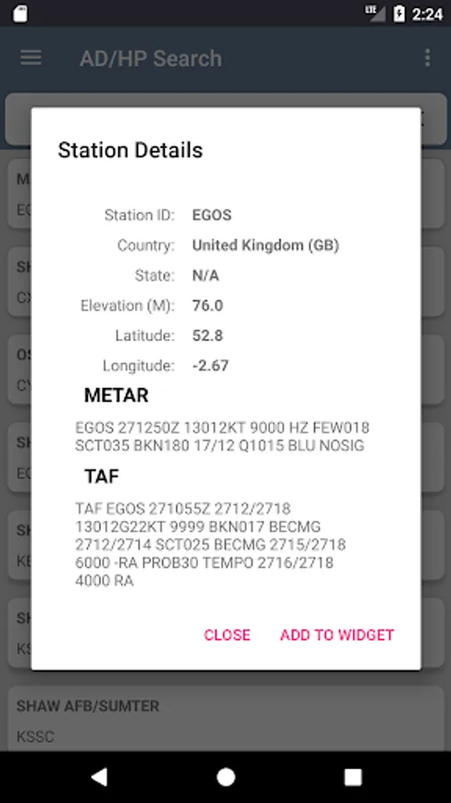 You can also search for any information by searching for a partial AD/HP name, minimum 4 characters and by choosing from the list that is returned, you can view the weather information for that station. You can also select one station to be displayed in a Widget that can be added to any of your device home screens, this provides up to date information without having to open the App.