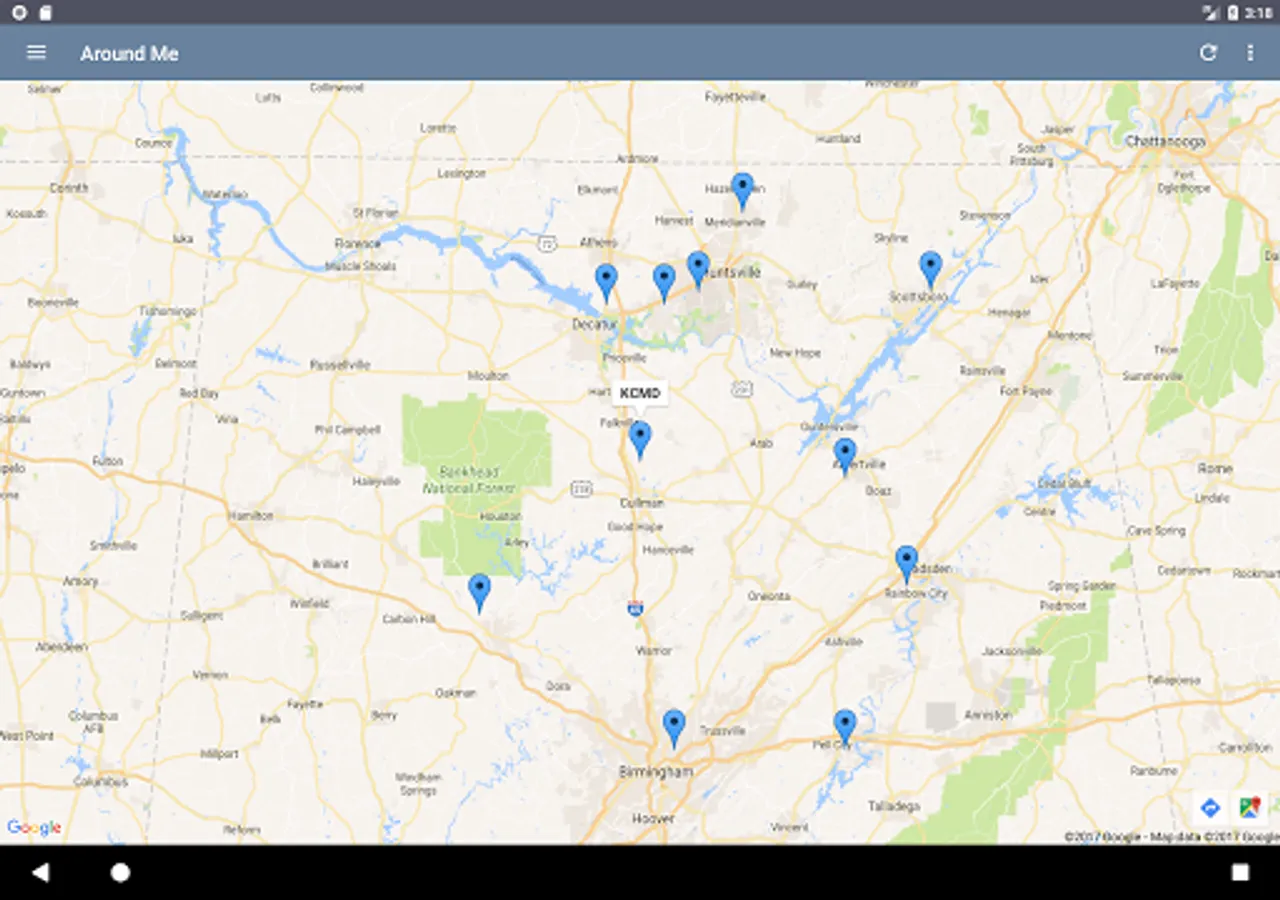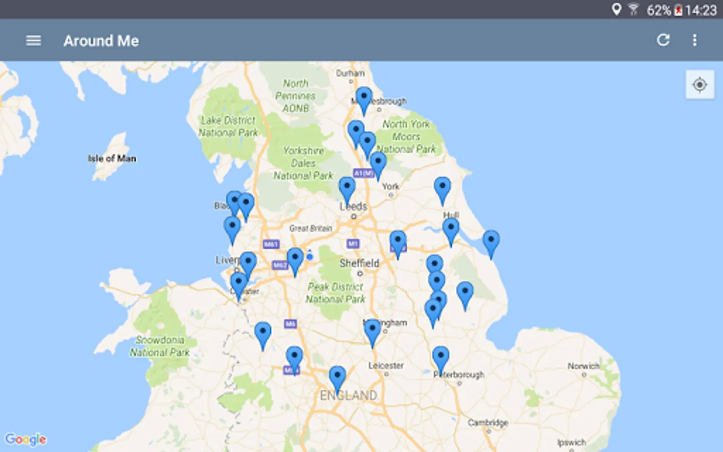 The Around Me function loads a Map and plots either TAFs or METARs around your current location at a distance you set in the App settings as default or dynamically by clicking the refresh button in the toolbar.