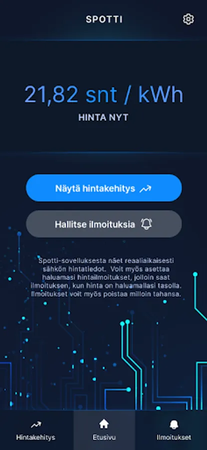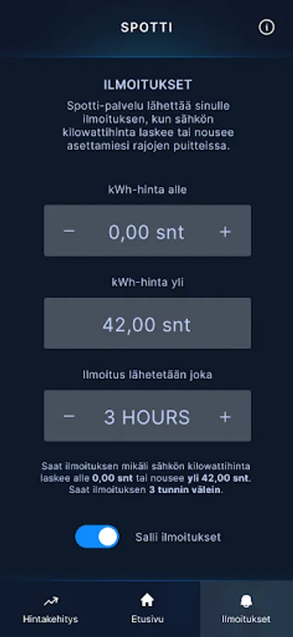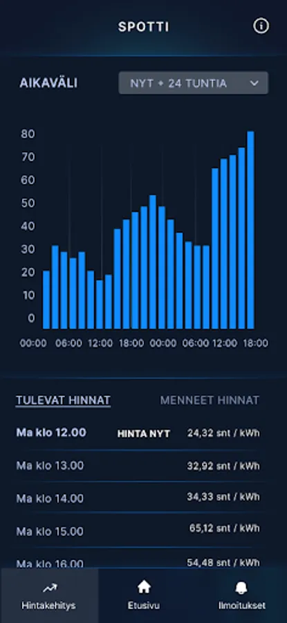 In the Spotti application, you can see the hourly price of electricity in real time, i.e. the Spot exchange price. You can also set the price notifications you want, so you get a notification when the price is at the level you want. You can also remove notifications at any time.