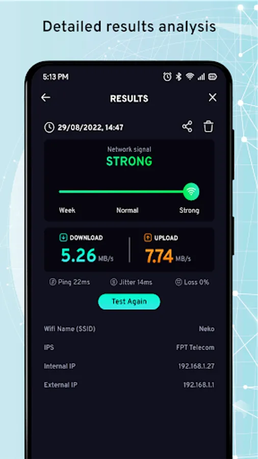 ✅ Save the results: The results of each WiFi speed test are always precisely and thoroughly recorded. They can be easily shared across other apps as detailed report files.