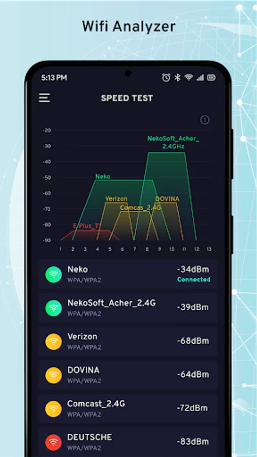 ✅ WiFi Analyzer: Visually and detailed description of WiFi channels signal strength through graphs; easily filter out strong or poor WiFi signals; intuitively and clearly describe strength levels of the WiFi connection.