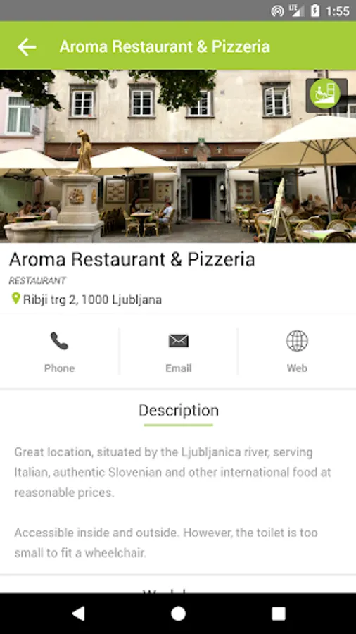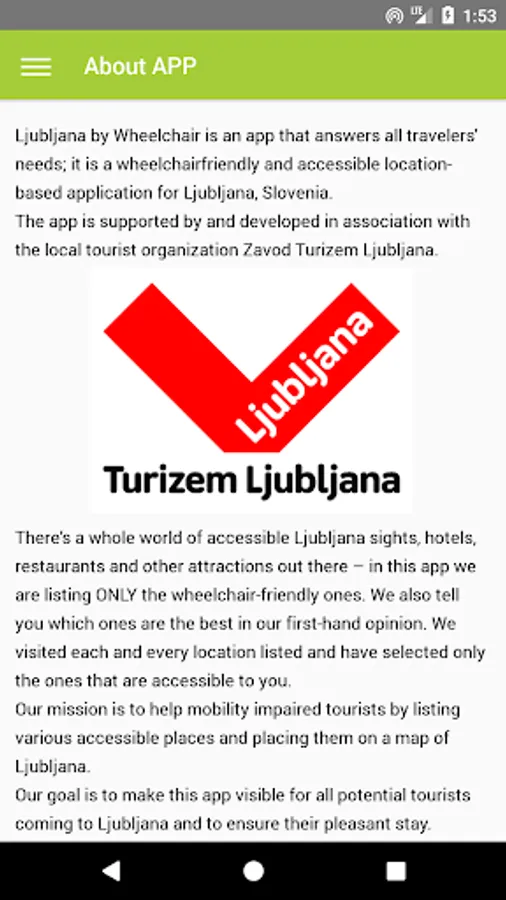ANG: Ljubljana by Wheelchair is an app, covering the needs of wheelchair user tourists. App is user friendly, easy to use, and enables a simple search of relevant touristic information about Ljubljana for a wheelchair user.