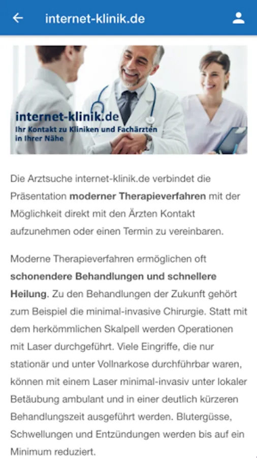 internet clinic doctor search is the app for the new specialist portal www.internet-klinik.de, which specializes in finding specialists with modern therapies without lengthy research. The new specialist portal internet-klinik.de combines the presentation of modern therapy methods with the possibility of making an appointment directly. It is also possible to make an appointment via the internet-klinik.de hotline. The app enables quick, direct access to the doctor search and much more information.