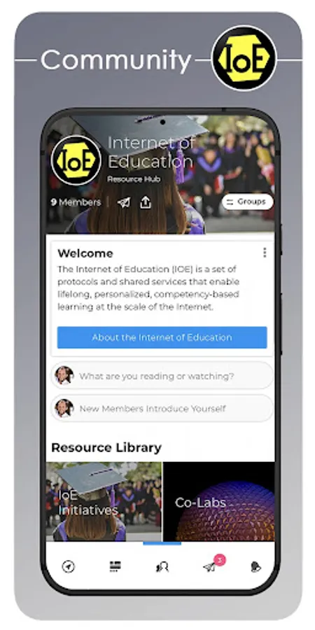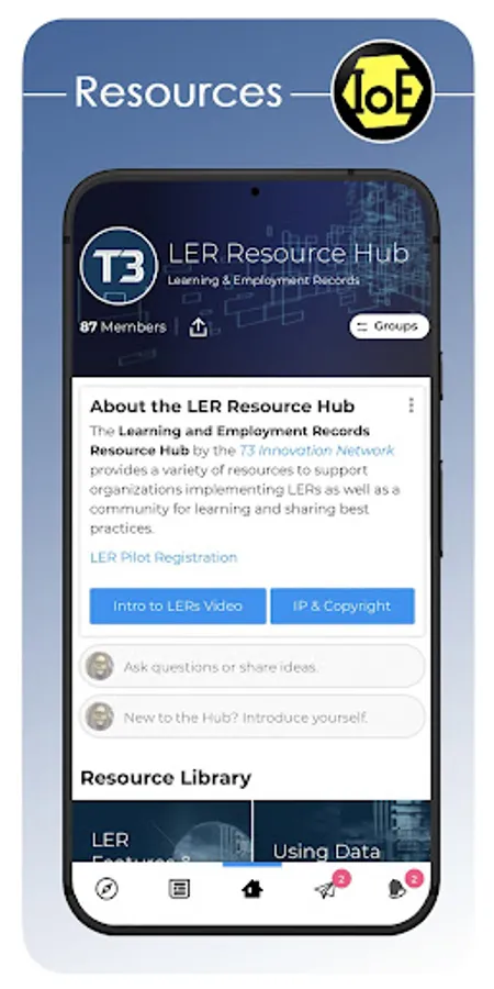 Research: The IoE app comes packed with research for co-lab’s and anyone involved in the future of education and work. Learn about learning and employment data standards, skills libraries, and identity. Join a pilots community, engage with shared services, and research.