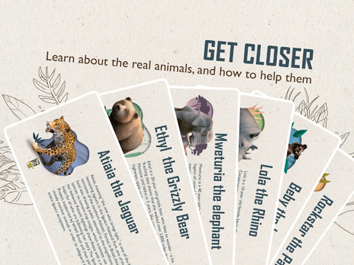 All animals featured in Safari Central are based on real individual animals in the wild, protected by WWF-Brazil, Conservation International, Tswalu Foundation, Ol Pejeta Conservancy, Space for Giants and the Chicago Zoological Society. We lovingly model & animate them in 3D... to bring you closer than ever before! And there are more to come very soon!
