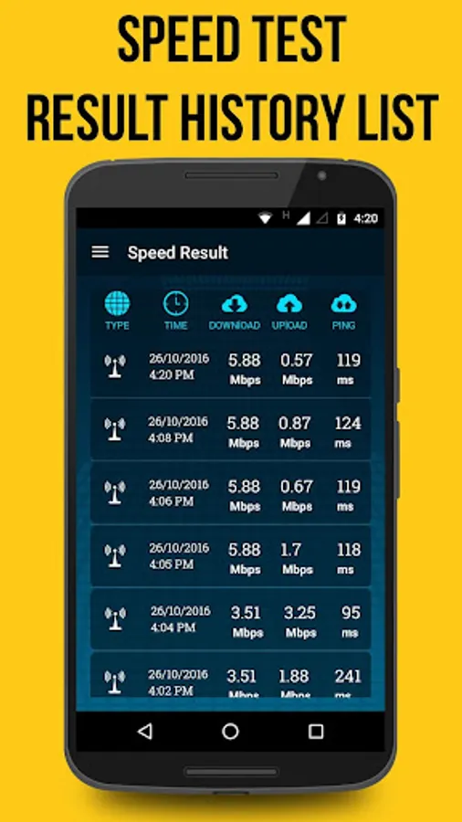 - Speed Test Result History. This includes download and upload speed, ping, signal strength.