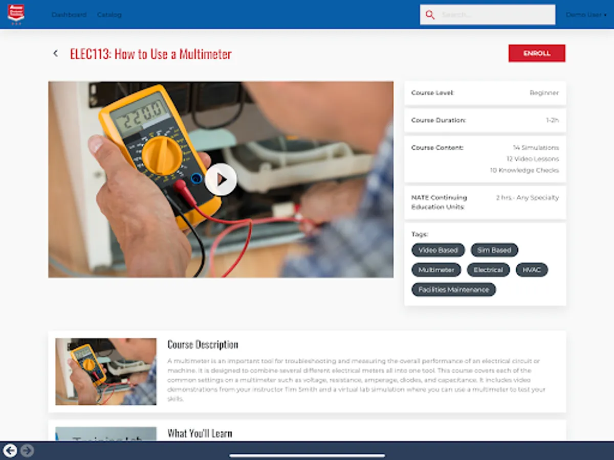 Amana Brand is an online, on-demand learning experience platform delivering a growing catalog of courses for the skilled trades industry. Get the training you need to reach that next level in HVAC, Plumbing, and Electrical. Plus, our catalog keeps growing. You’ll find hundreds of hours of training including video and scenario-based exercises across different equipment types. Hone your skills and be ready for whatever the real world throws at you.