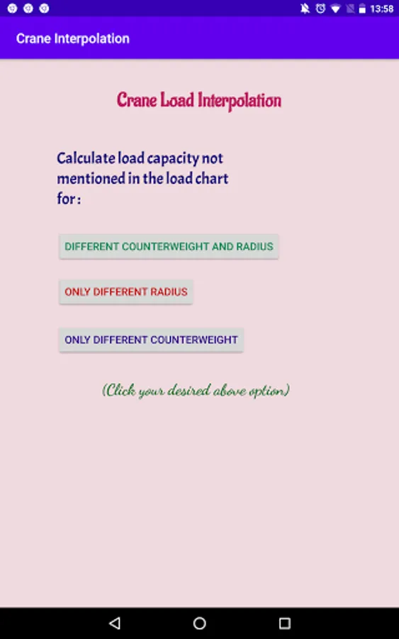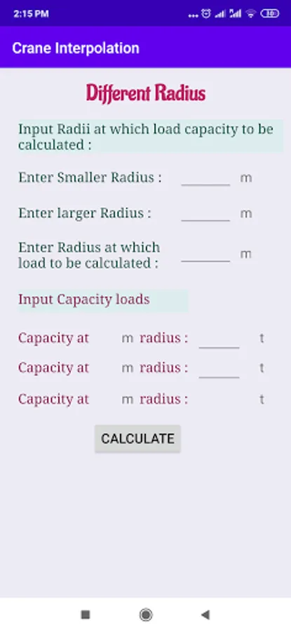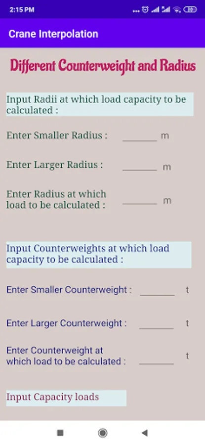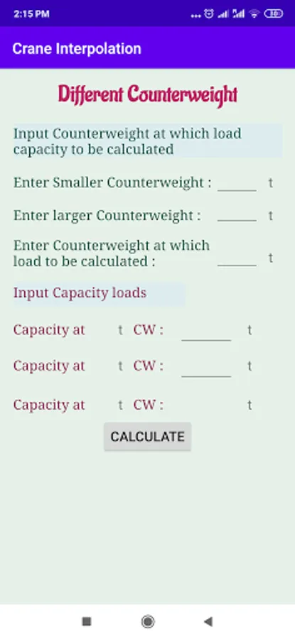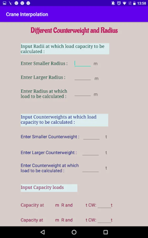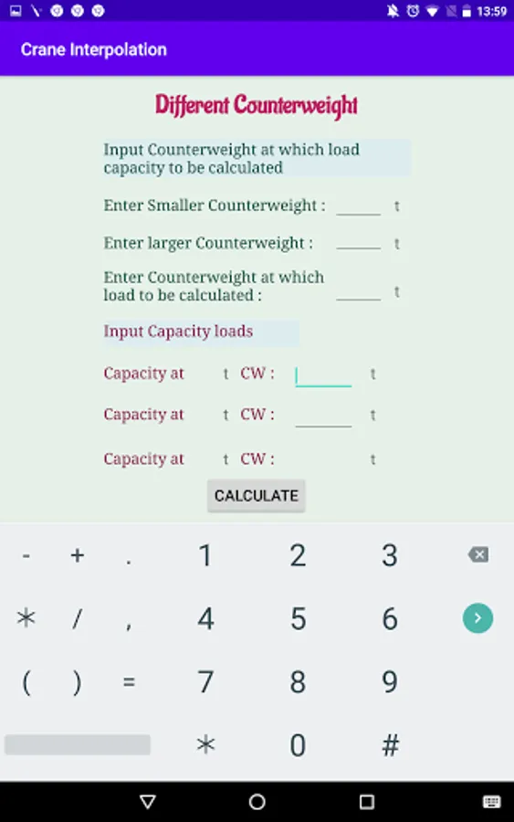 Crane Interpolation is an app for the people involved in heavy lift industry with cranes. It can help you calculate the load capacity for specific crane radius and counterweight, for which load capacity is not mentioned. It performs interpolation between the values specified in the load chart.