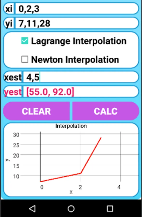 Calculating interpolation values for Newton and Lagrange functions is the primary intent of this math calculator of interpolations. Input values, select interpolation type and hit the calculation option to do the trick.