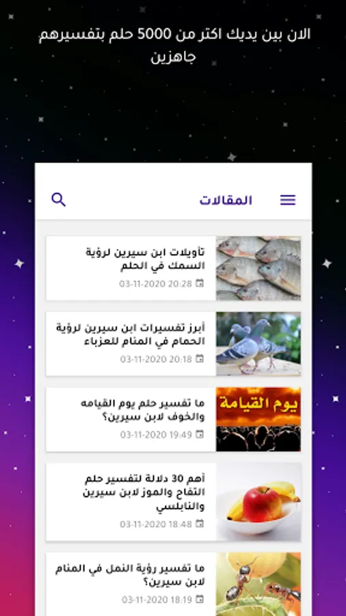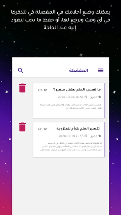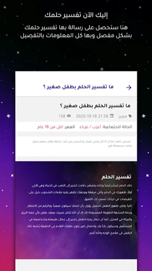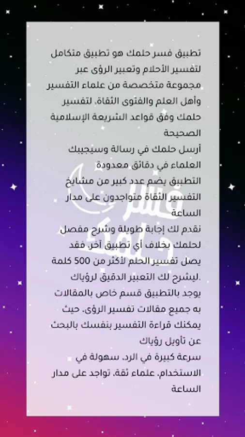 Stop searching for dream interpreters numbers and download the "Interpret your dream" application now and enjoy its many features and great services that it offers. It is fast and easy to use and makes it easy for you to communicate with the interpreters. It also contains many dream interpretation articles that you can read for free, and when you download the application you can subscribe to the package Which suits you from its special packages at low prices and your experience with the application will be great because we understand your needs, communicate with you and listen to your suggestions in order to gain his confidence and provide you with a distinctive service.