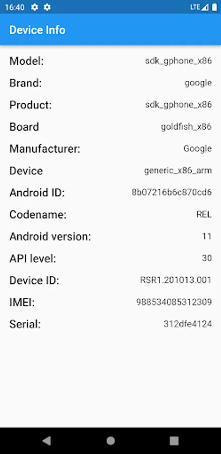 The application provides comprehensive information about the device with the Android operating system. Android version, IMEI, Device ID and other data.
