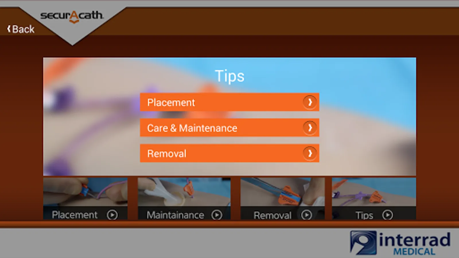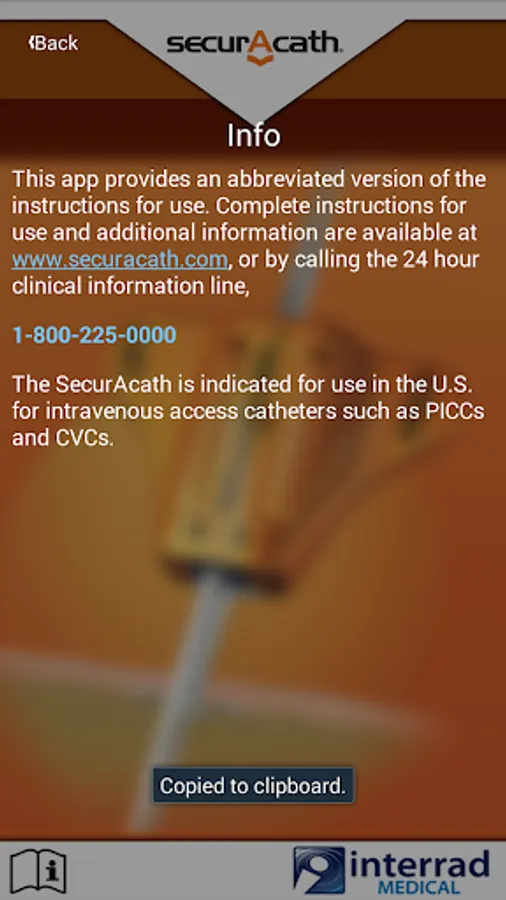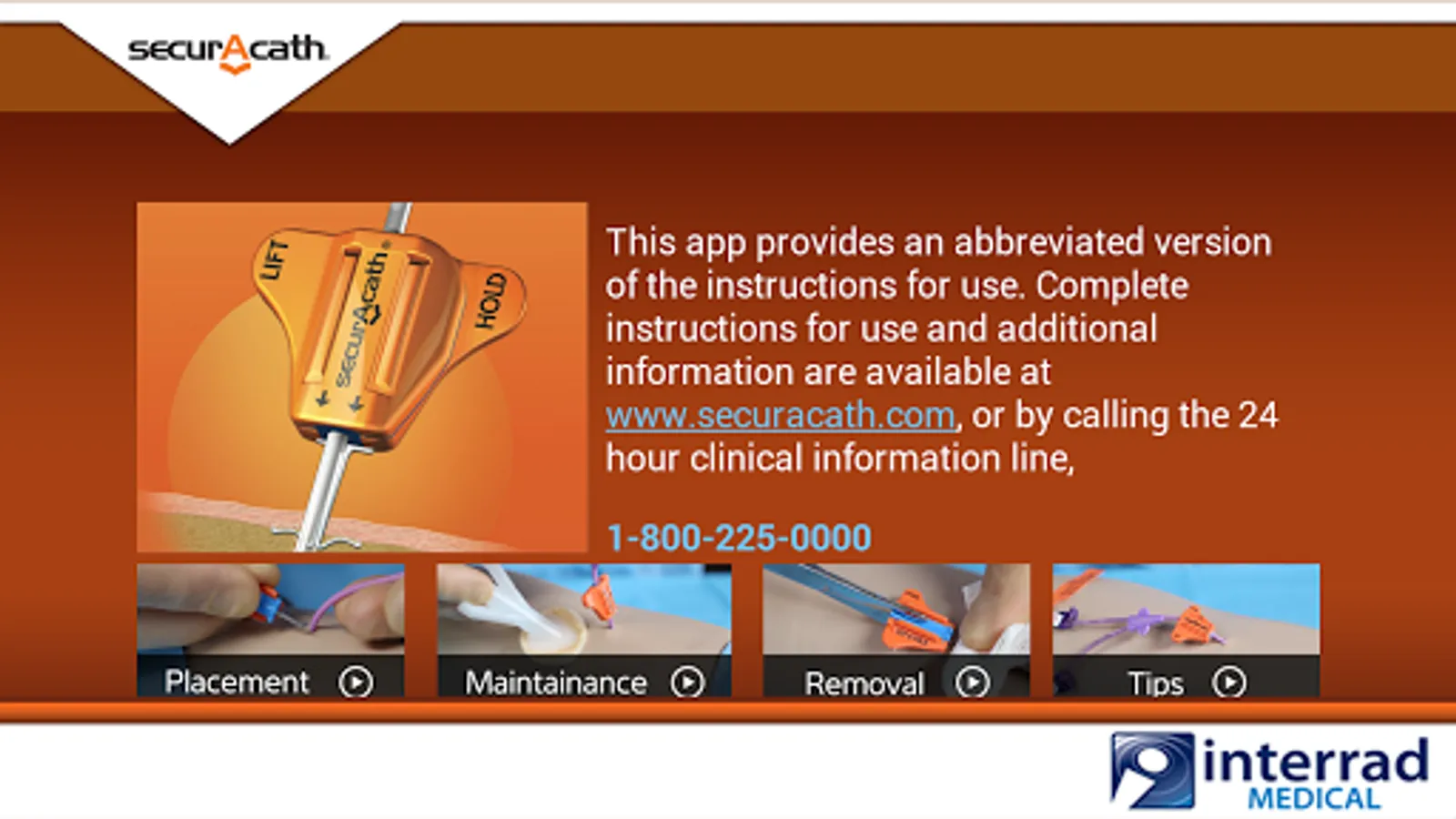 This app provides an abbreviated version of the instructions for use. Complete instructions for use and additional information are available at www.securacath.com, or by calling the 24 hour clinical information line,