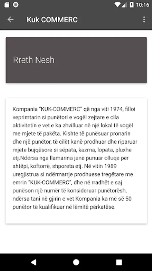Kompania “KUK-COMMERC” që nga viti 1974, filloi veprimtarin si punëtori e vogël zejtare e cila aktivitetin e vet e ka zhvilluar në një lokal të vogël me mjete të pakëta. Kishte të punësuar pronarin dhe një punëtor, të cilët kanë prodhuar dhe riparuar mjete bujqësore si sëpata, kazma, lopata, pluxhe etj.Ndërsa nga llamarina janë punuar olluqe për shtëpi, koftorrë, shporeta etj. Në vitin 1989 uregjistrua si ndërmarrje prodhuese tregëtare me emrin “KUK-COMMERC”, dhe në rradhët e saj punëson një numër të konsideruar punëtorësh, ndërsa tani në gjirin e vet Kompania ka më së 50 punëtor të kualifikuar në lëmitë përkatëse.