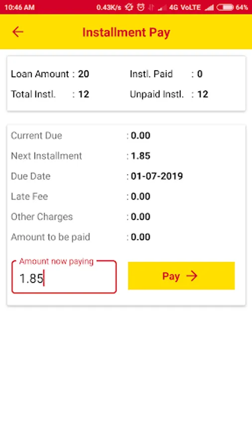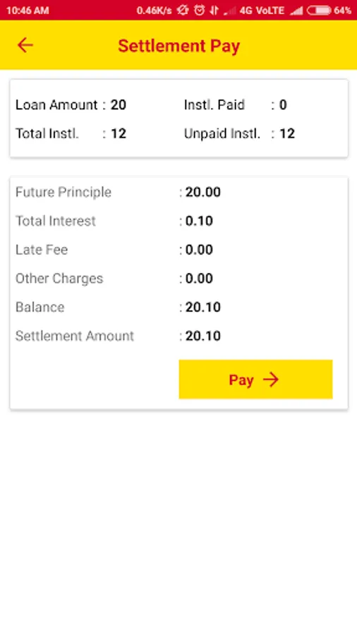 Interest Rate - 20% (on reducing principal balance interest calculation)