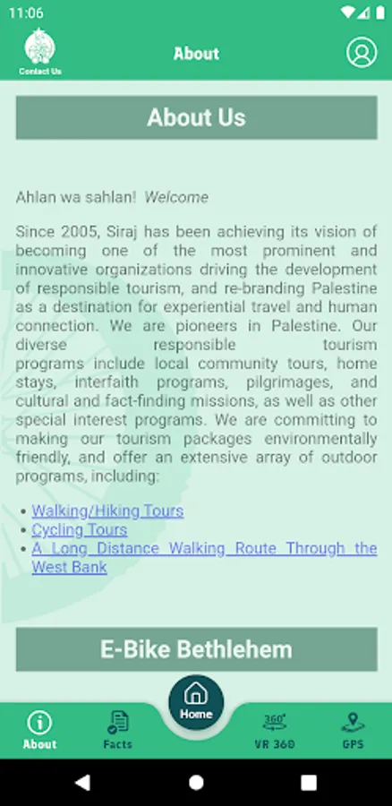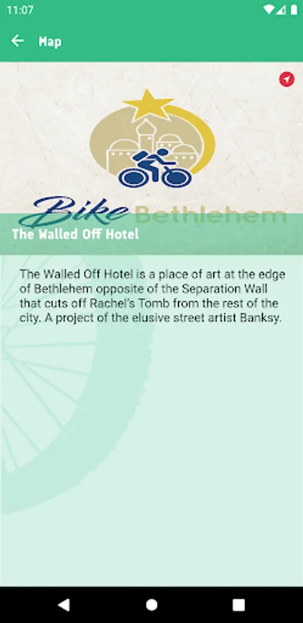 E-Bike Bethlehem is an App that provides tourists visiting the governorate of Bethlehem with a virtual tour through a selection of the area’s most mesmerizing places. The App is also a promotional tool to the E-Bike service provided by a local tourist center and contains a lot of useful information about the city of Bethlehem and its neighboring area.