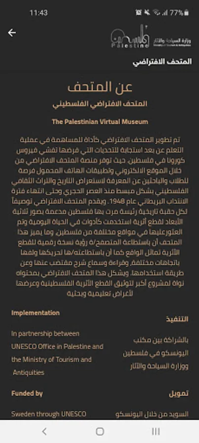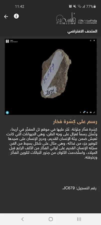 A summary on each object describes the shape, color, material and use in addition to the place where the object was found in Palestine. The user can listen to an audio narration for this summary which provides an interesting atmosphere while observing the details of the objects.
