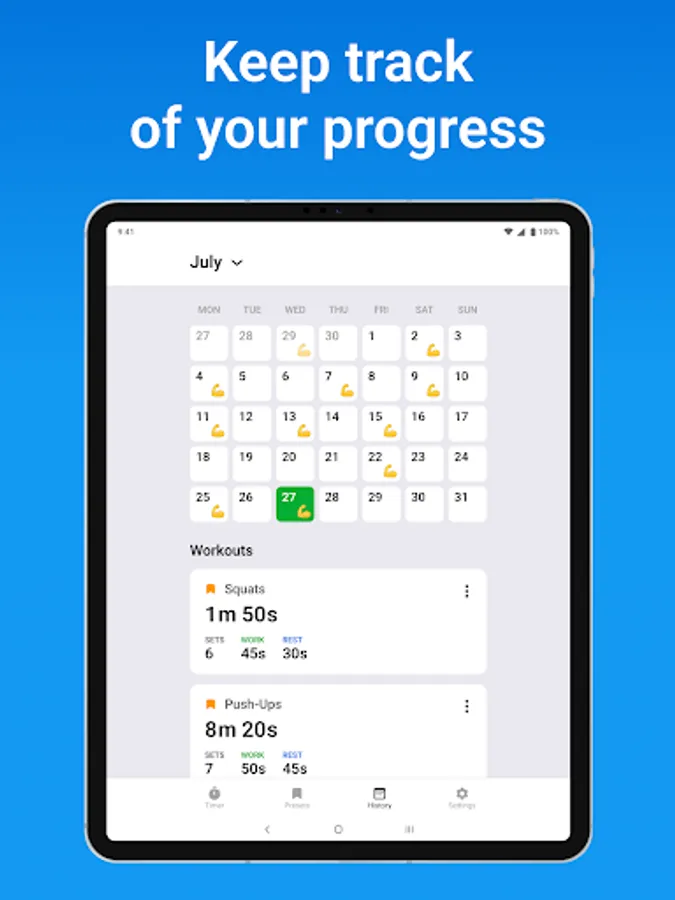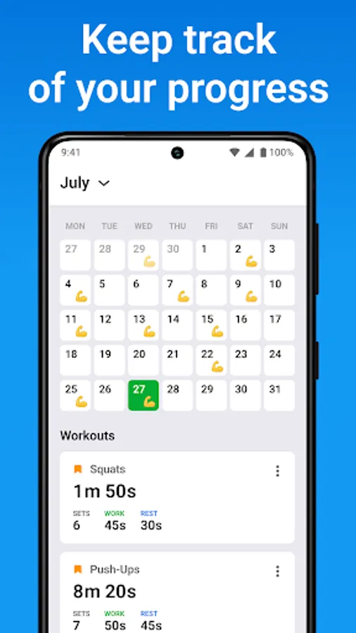 Track your workouts with a Calendar. Plan and track events, and get notified when you have a training scheduled. With this feature, you will not miss a single workout and will keep track of your progress.