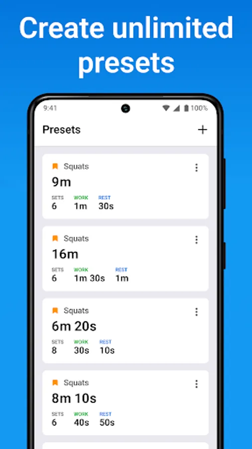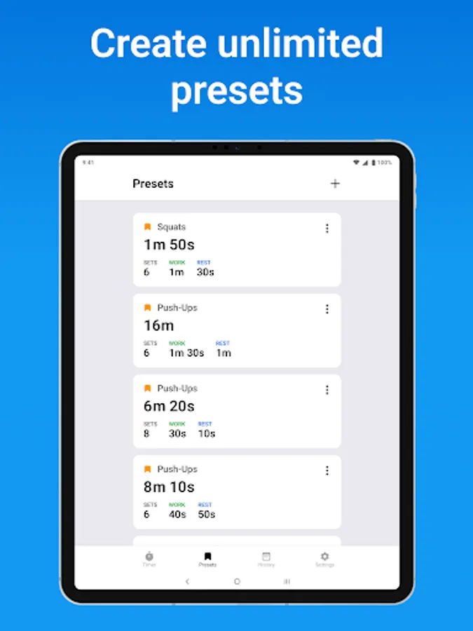 Save your workouts in the presets section. It's also possible to create your own custom intervals. You can add an unlimited number of presets.