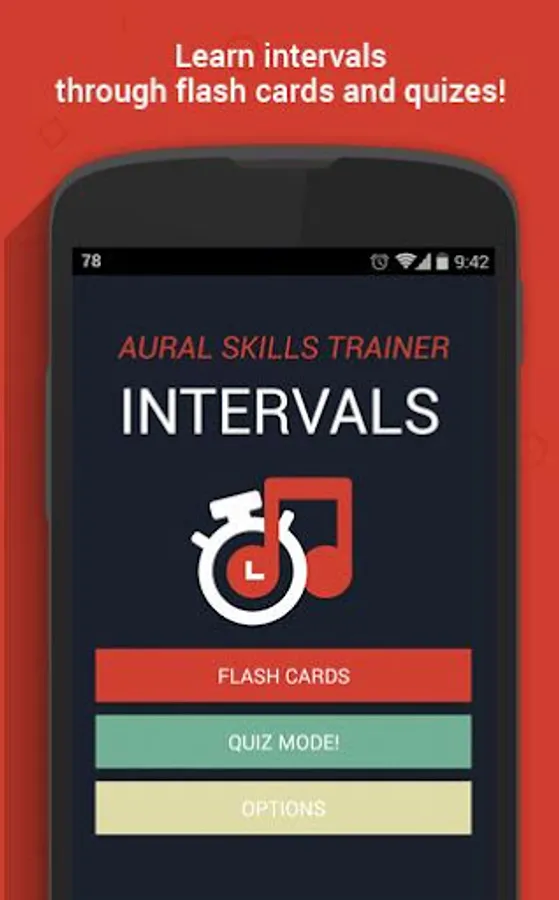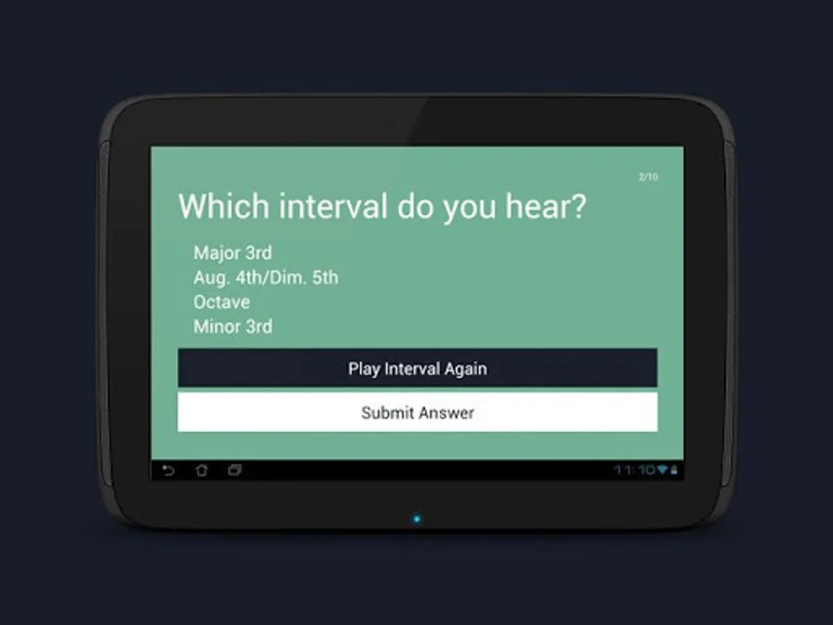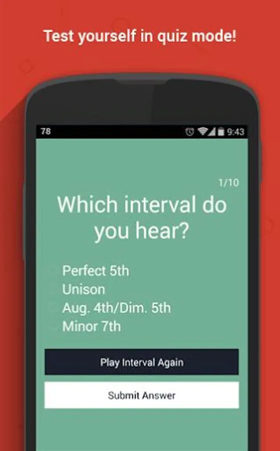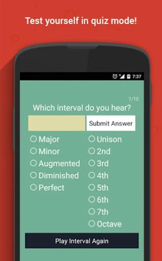 -Quiz Mode: Test your knowledge! The multiple choice quiz mode plays an interval for the user to identify from a list of four options. The comprehensive quiz mode has all of the qualities and numbers to choose the correct answer from, based on the difficulty chosen.