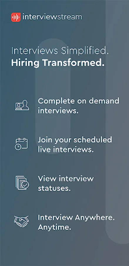 The interviewstream mobile app enables candidates to complete their digital interviews. You can use our app to be interviewed via live video or to record and upload your interview.