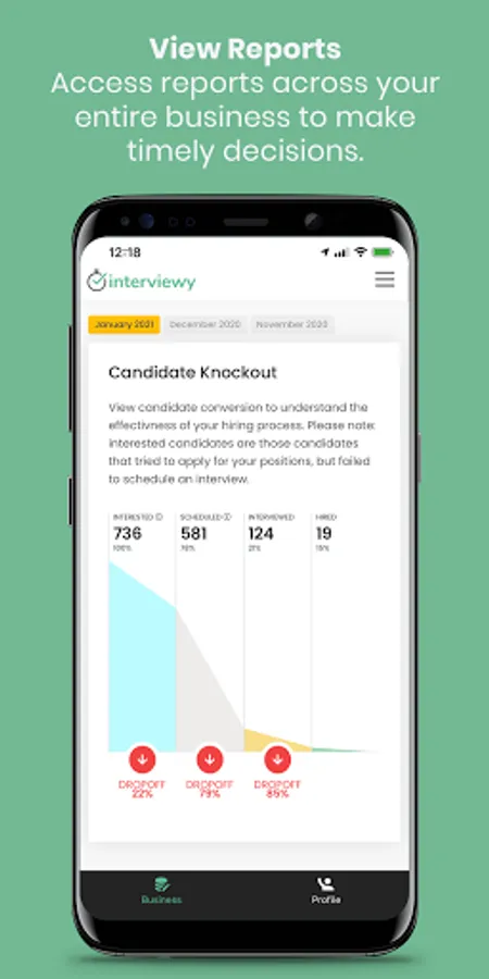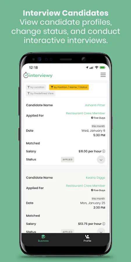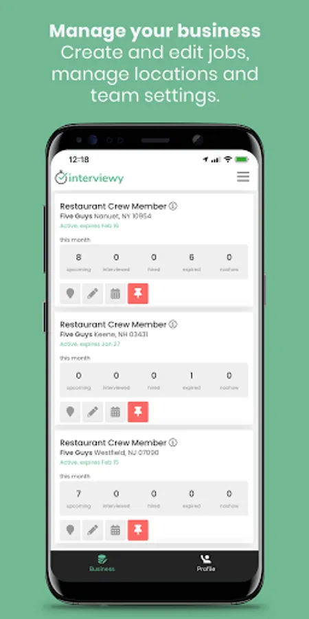 Interviewy Business is an application for employer accounts registered with hiring platform Interviewy. Manage your business account and connect team members directly from one app, without the need to look access account from other devices. Your team will enjoy the increased productivity, ease of use, and intuitive interface to make your hiring process faster than ever before.