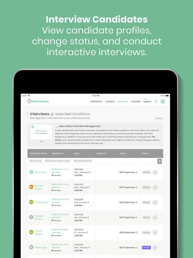 • View candidate profiles, change status, and conduct interactive interviews.