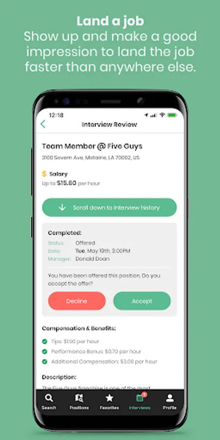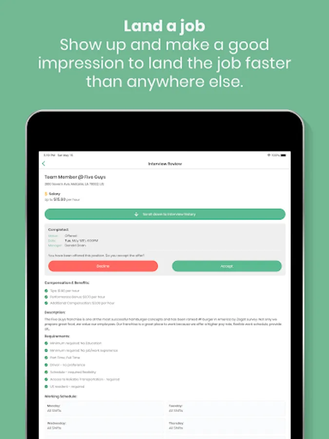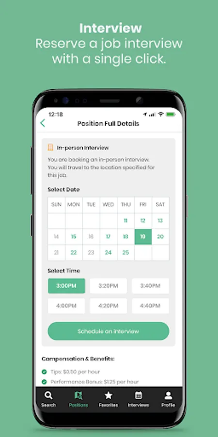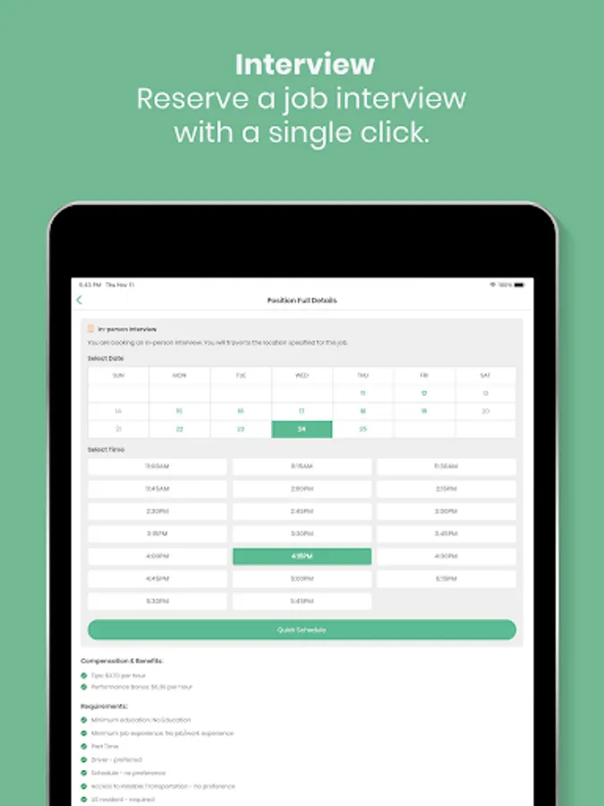 • Click to interview – single-click interview scheduling. Apply for an interview right away using our scheduling system to land a job faster. Track your interview progress directly via the application and get notified when you have been hired for a position.