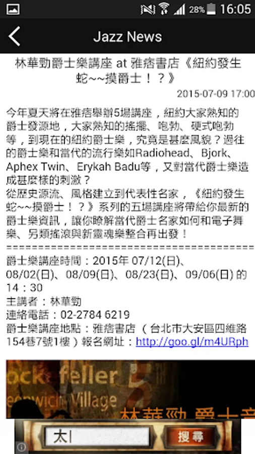 [Taipei Jazz Live Jazz around Taipei touring scene] Facebook page, provide a more detailed explanation of each performance, the latest update Taipei jazz performances Message: https://www.facebook.com/livejazztaipei