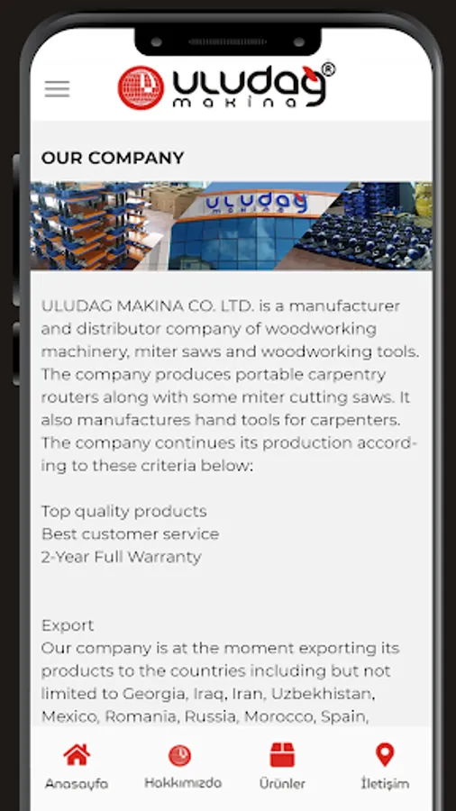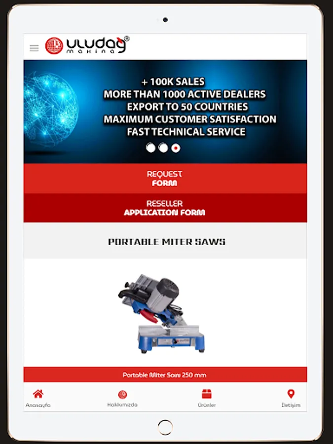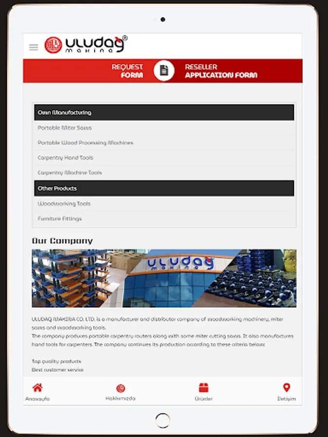Uludağ Makina Ltd., which manufactures portable woodworking machines - miter cutting machines and carpenter hand tools, and also imports furniture accessories. Sti. product catalog and dealer application