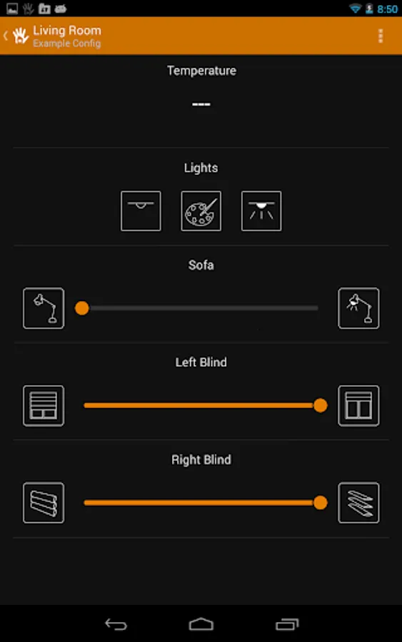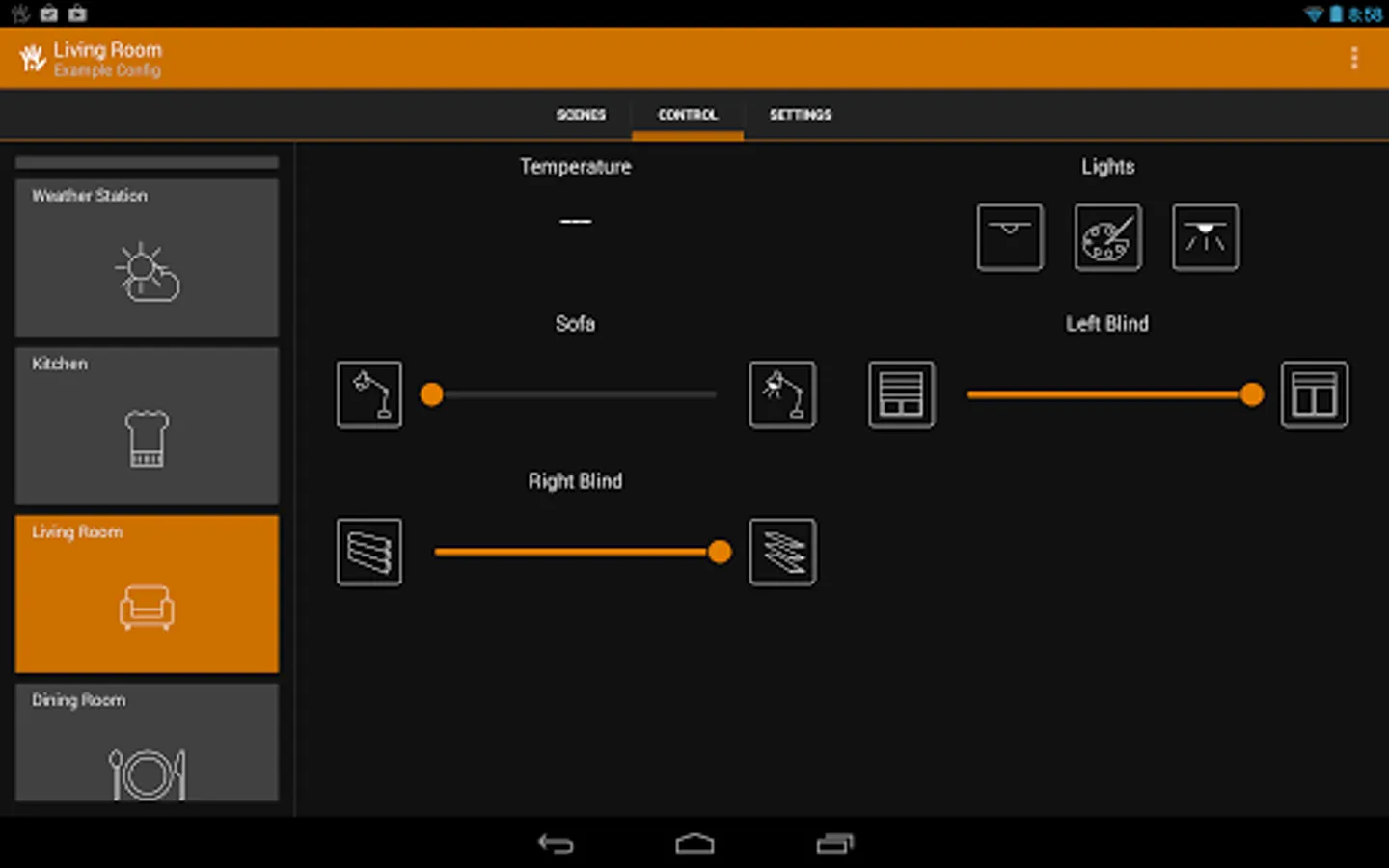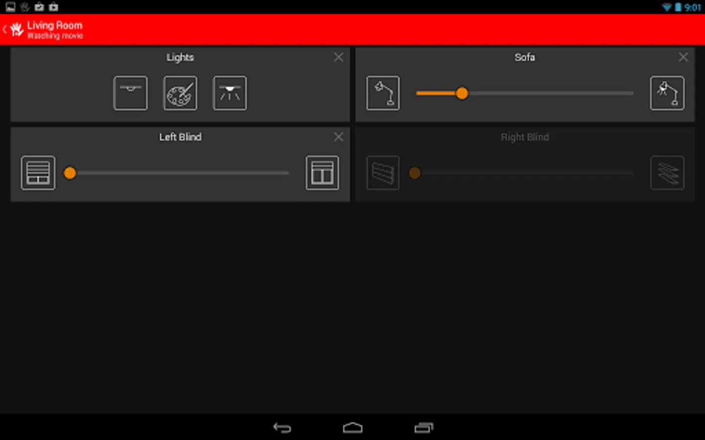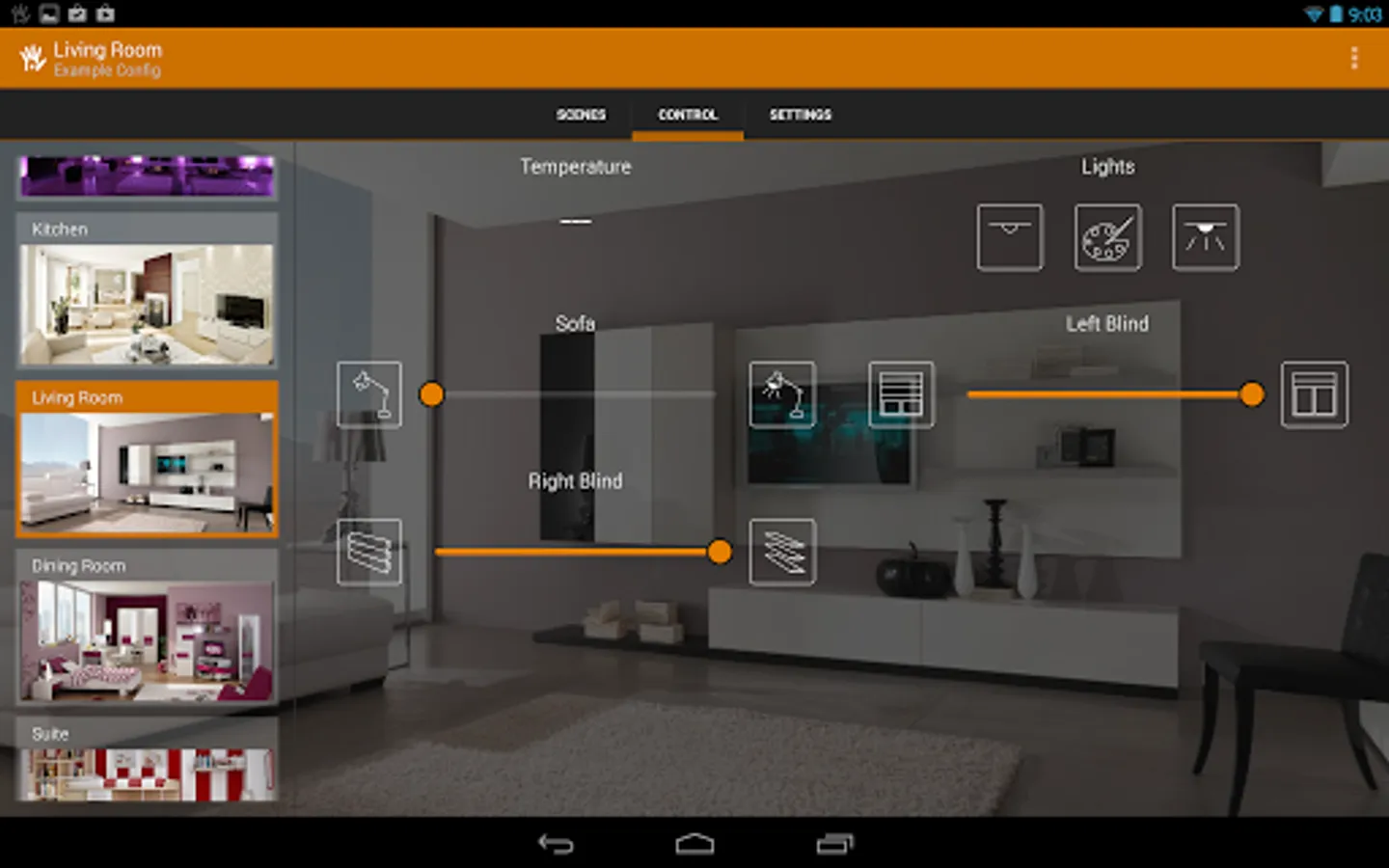 Houseinhand KNX allows you to create your own custom environments. You can set up, as an example, the “relax” environment that will adjust the main light to 30% and configure the setpoint temperature to 25ºC.