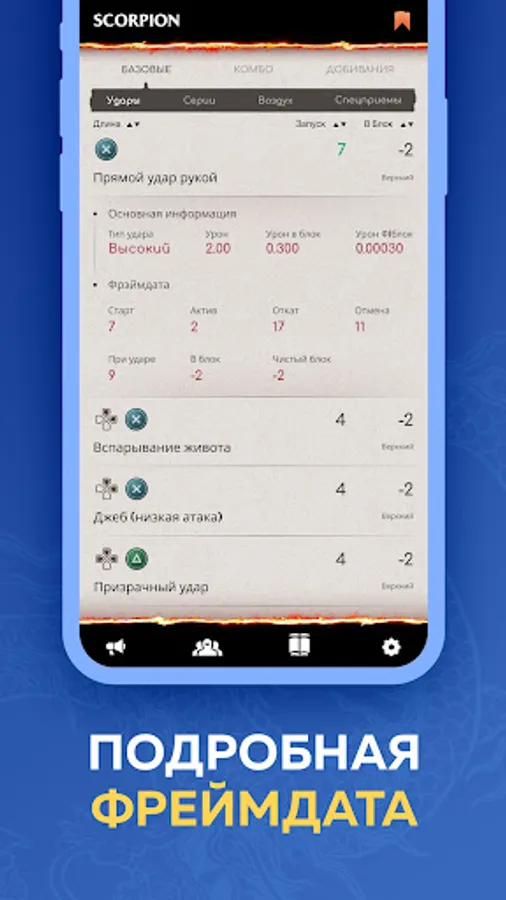 Beginners and experienced players can watch all the hits, series, special moves and fatalities for all characters. At the same time, you will find the most detailed framedata with unique useful features of Combat Guide 1.