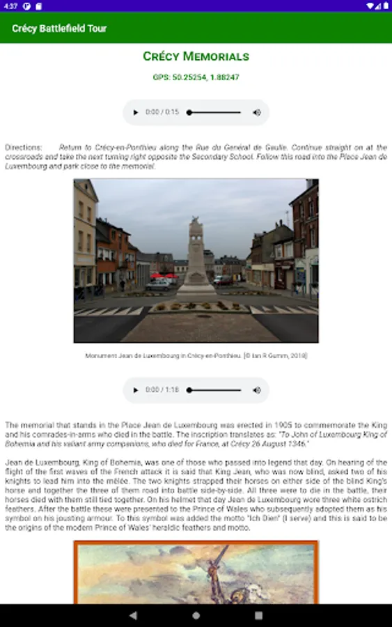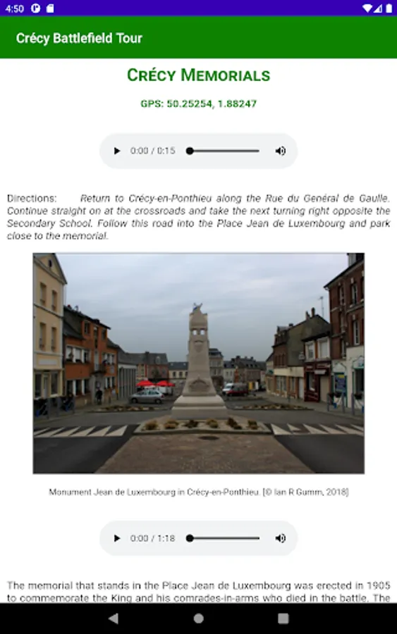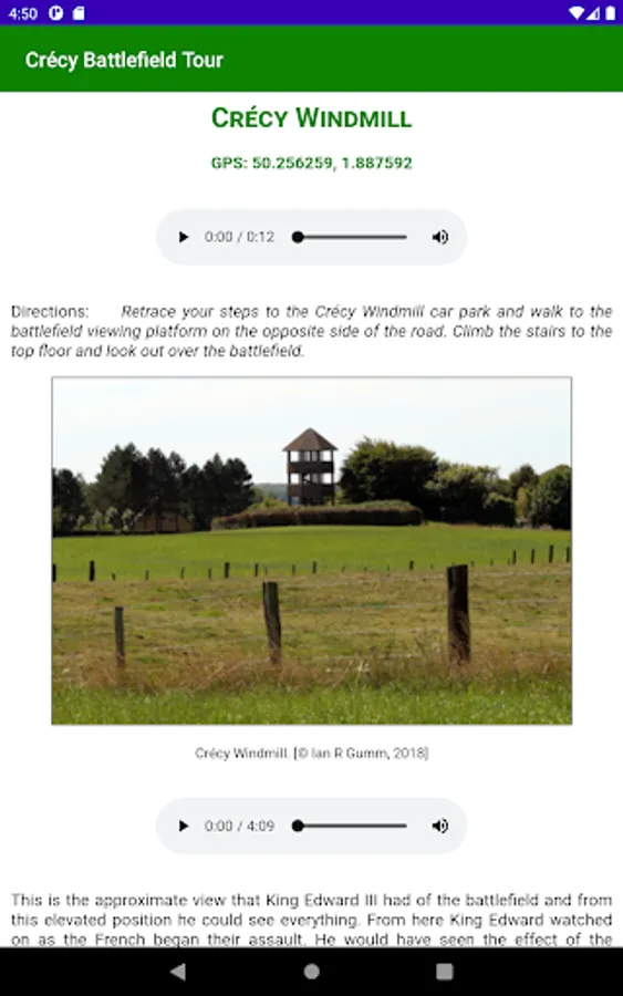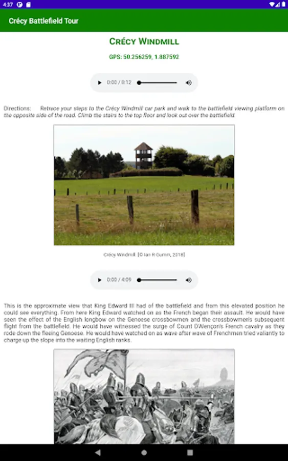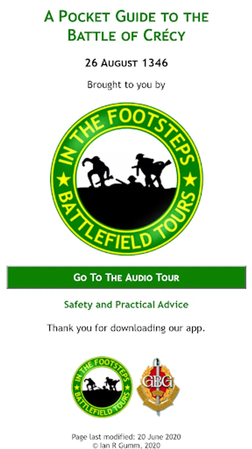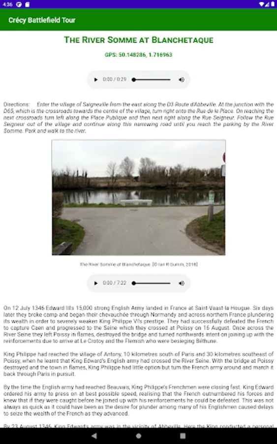 The app is a self-guided audio tour is designed to guide people around the major locations associated with the Battle of Crécy. It begins at Blanchetaque, where King Edward’s English Army crossed the River Somme prior to the battle. Then follows the French approach to the battlefield before concentrating on the site of the battle near Crécy-en-Ponthieu.