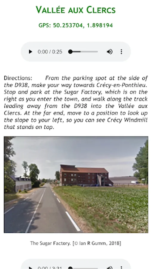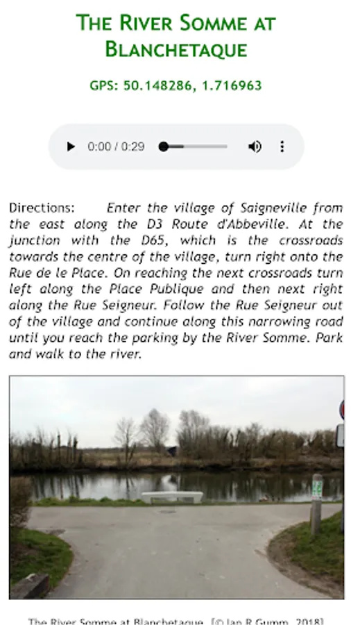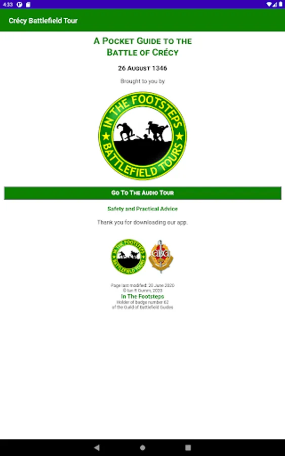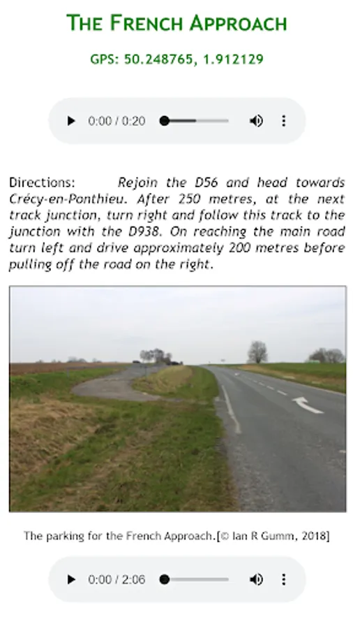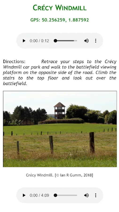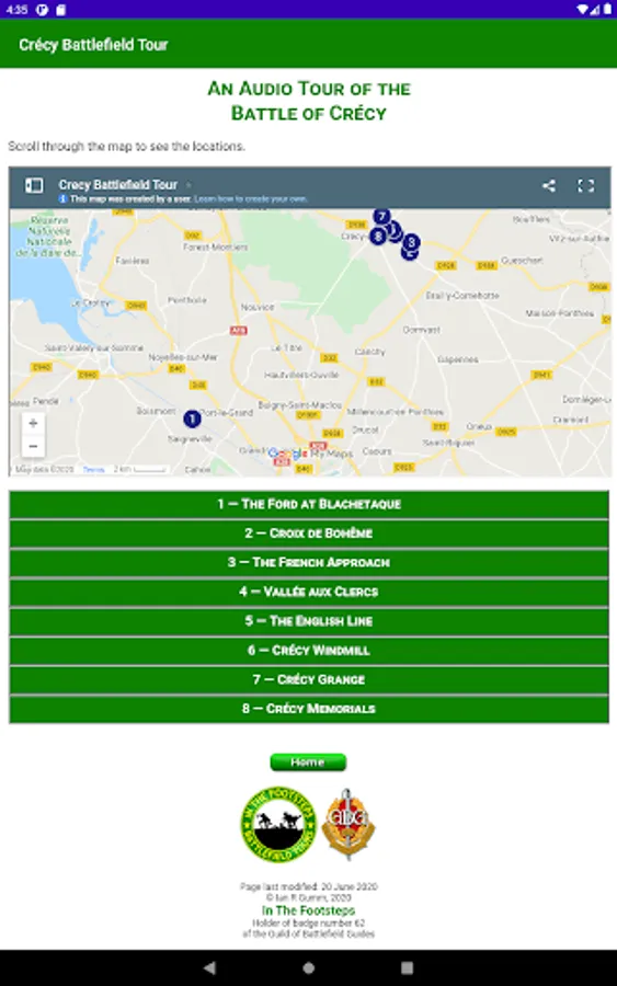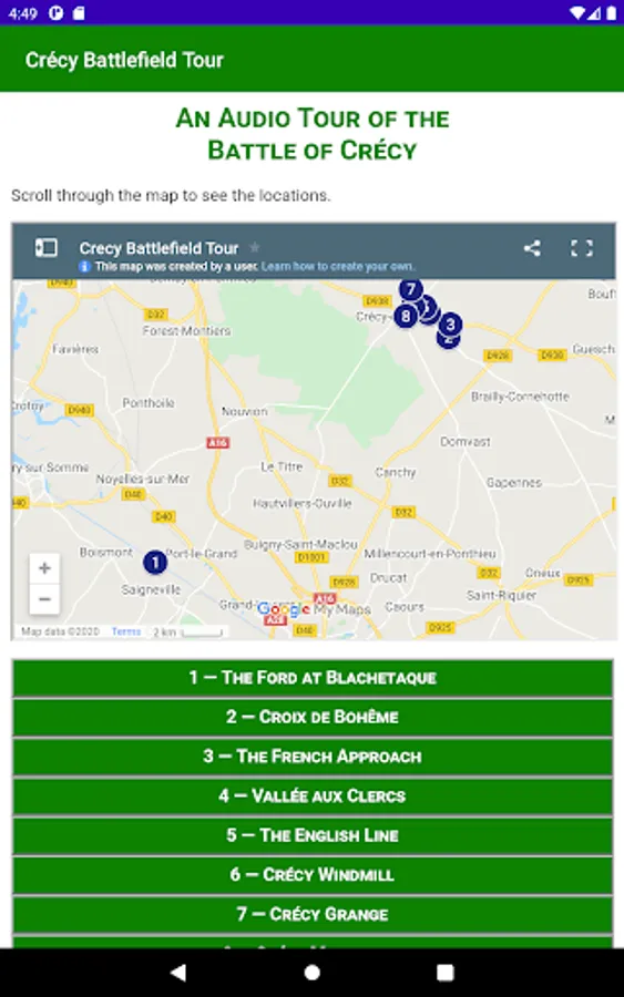 The app is a self-guided audio tour is designed to guide people around the major locations associated with the Battle of Crécy. It begins at Blanchetaque, where King Edward’s English Army crossed the River Somme prior to the battle. Then follows the French approach to the battlefield before concentrating on the site of the battle near Crécy-en-Ponthieu.