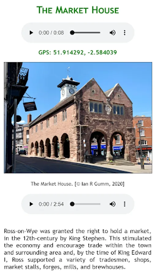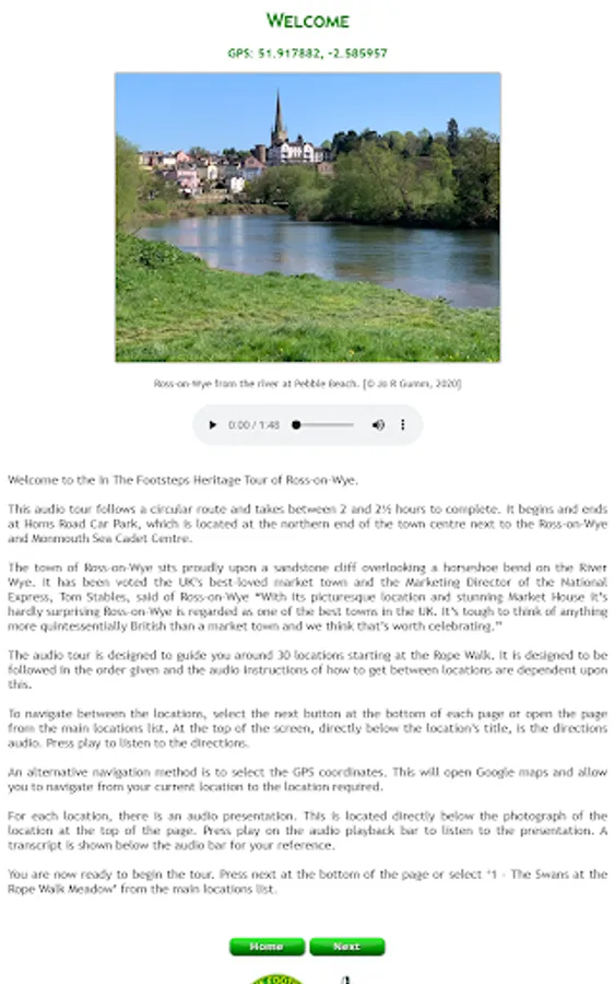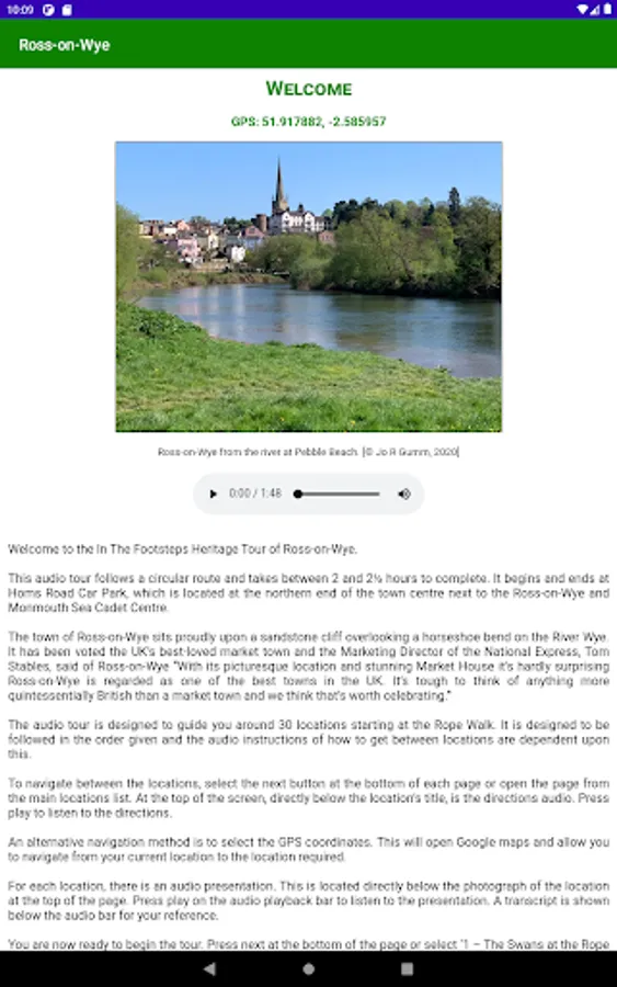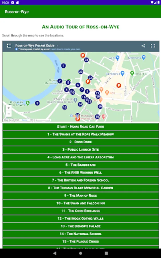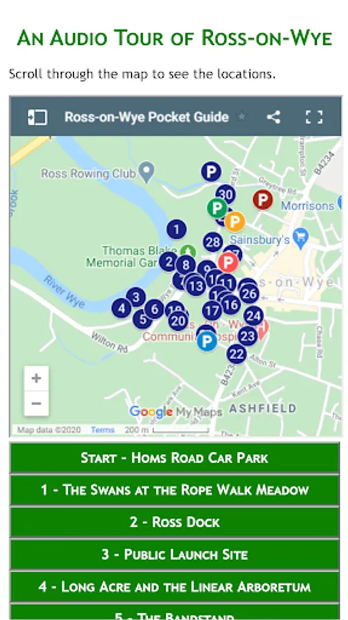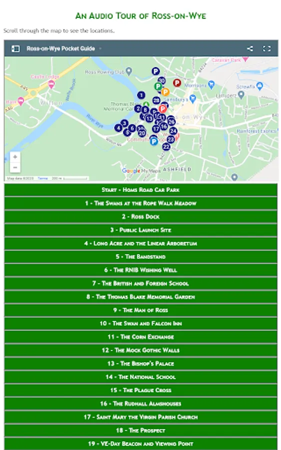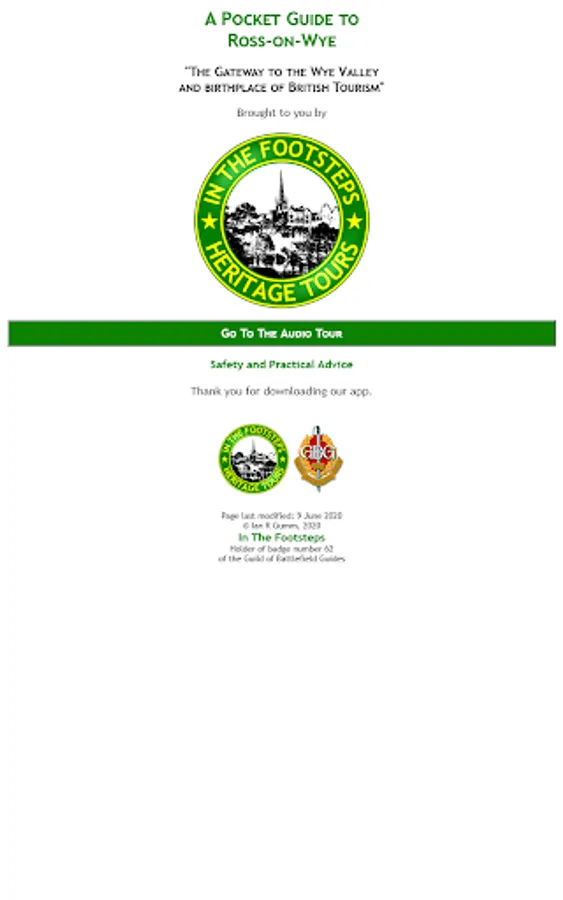 This app is a self-guided audio tour is designed to guide people around the lovely Herefordshire market town of Ross-on-Wye. It begins and ends at Homs Road Car Park, which is located at the northern end of the town centre next to the Ross-on-Wye and Monmouth Sea Cadet Centre.