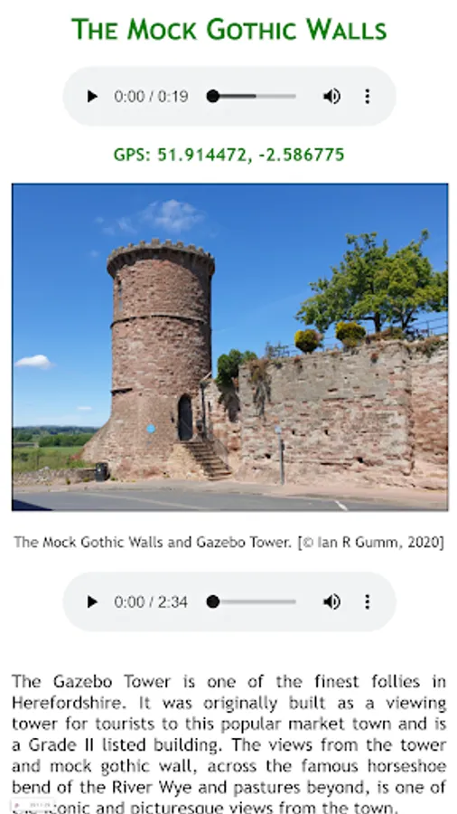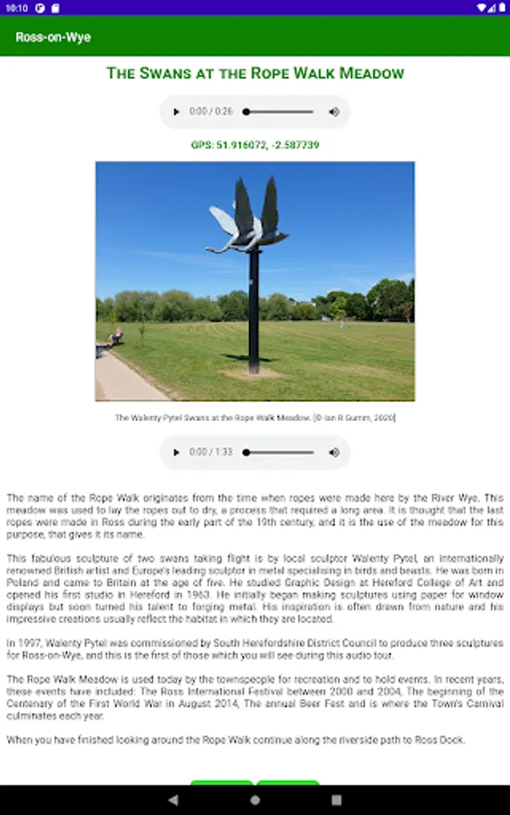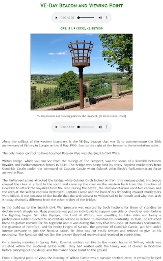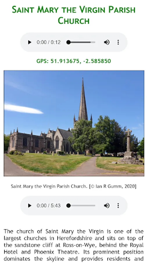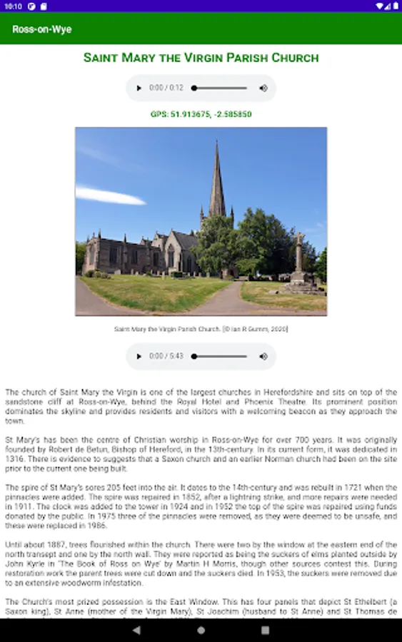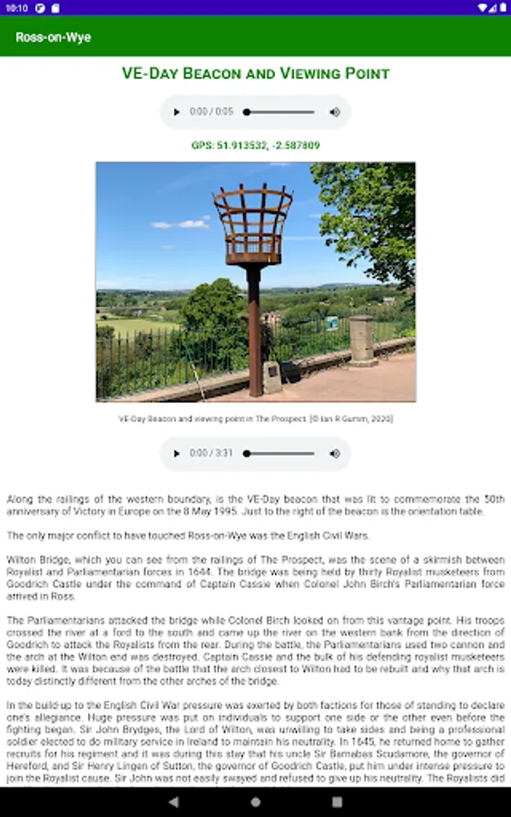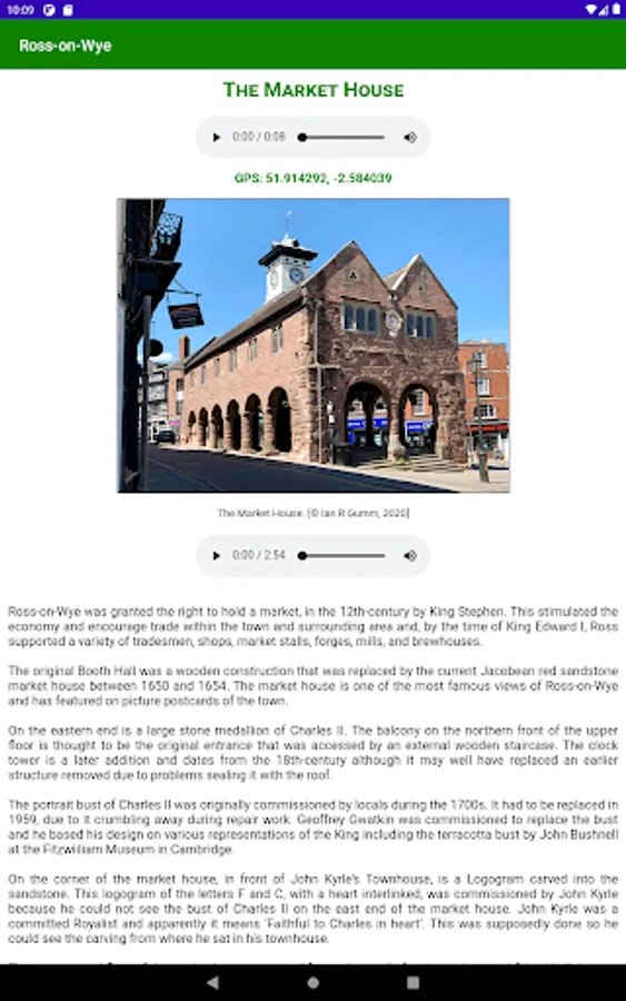 This app is a self-guided audio tour is designed to guide people around the lovely Herefordshire market town of Ross-on-Wye. It begins and ends at Homs Road Car Park, which is located at the northern end of the town centre next to the Ross-on-Wye and Monmouth Sea Cadet Centre.