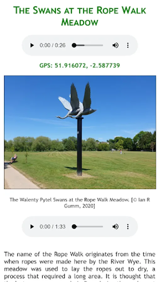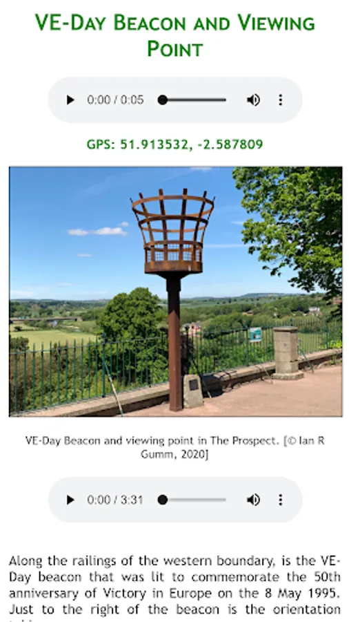 For each location, there is an audio presentation. This is located directly below the photograph of the location at the top of the page. Press play on the audio playback bar to listen to the presentation. A transcript of the audio presentation is shown below the audio bar for your reference.