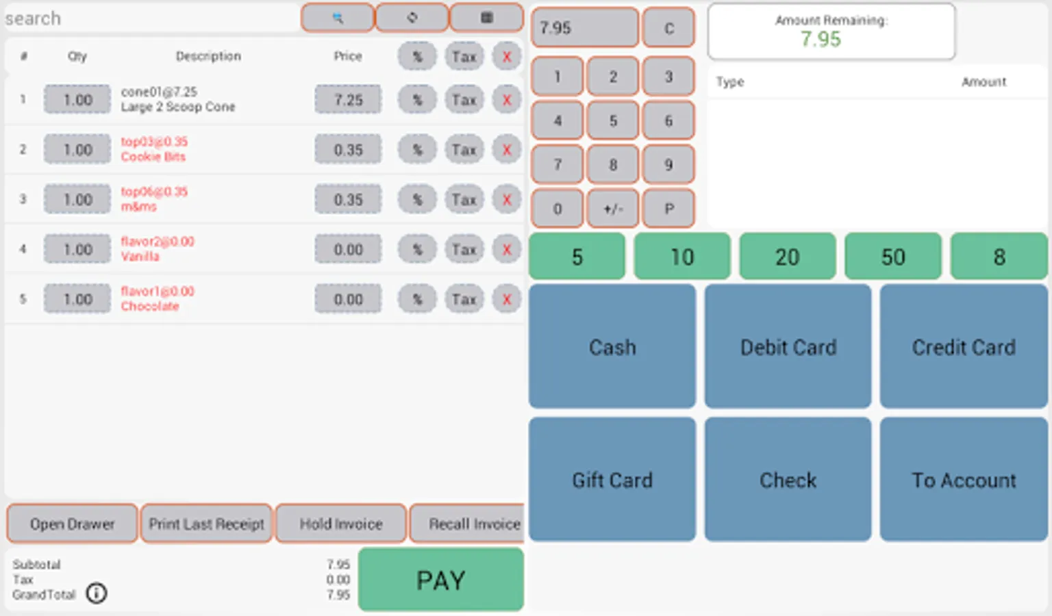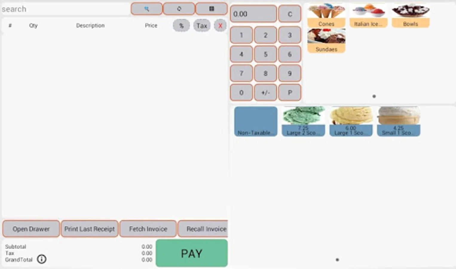 - Scan items, use on screen buttons, or manually look up inventory items to ring up!