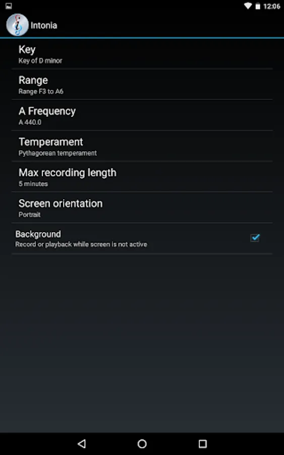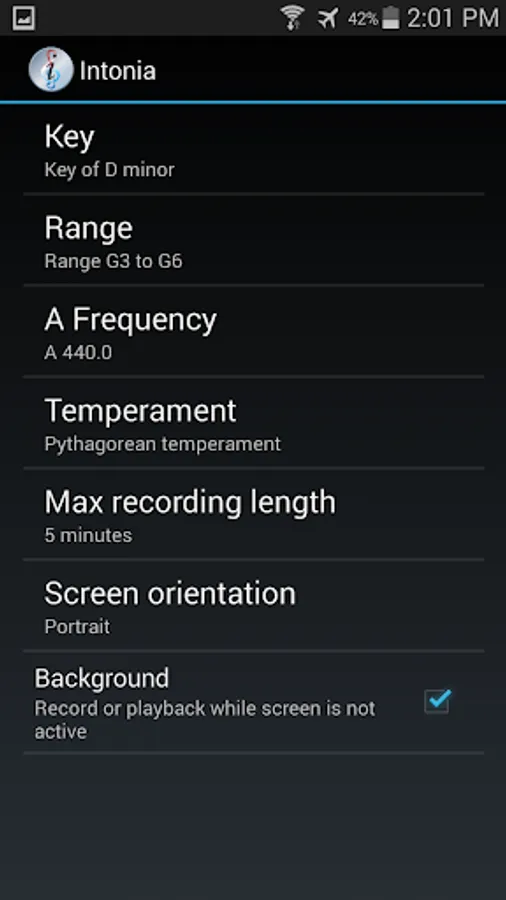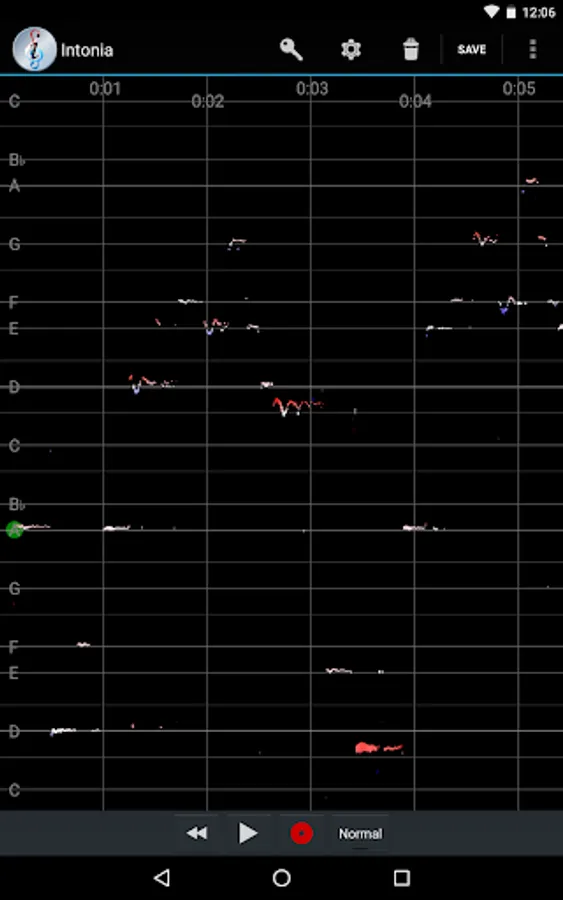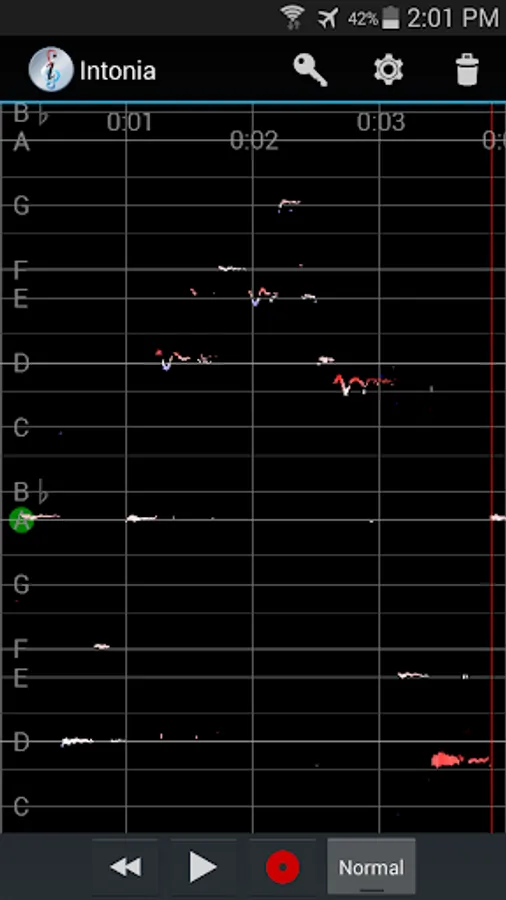 While it is recording, the display scrolls continuously. Your pitch is displayed as the height of the trace. If you're playing in tune the trace is white, but if you're sharp relative to your chosen scale and temperament, the trace is colored red. If you're flat, the trace is blue.
