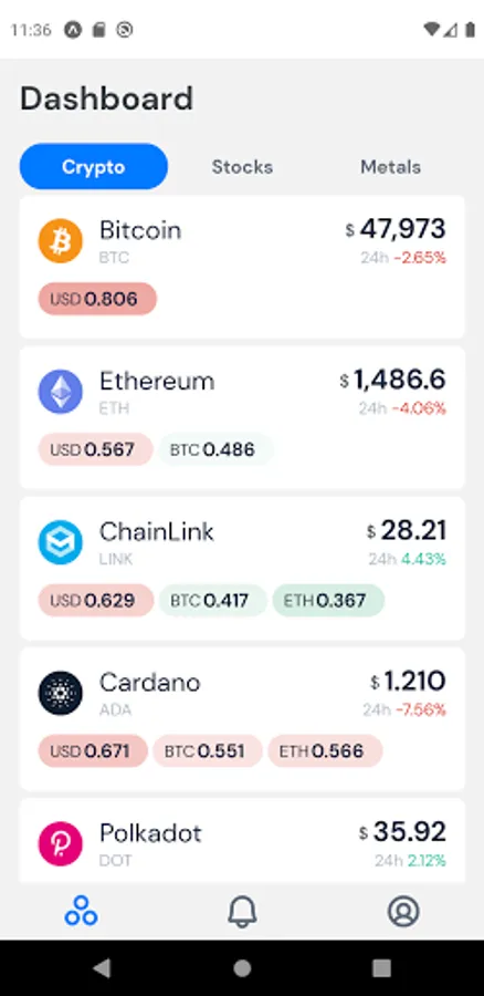 The app displays asset prices updated every minute. Tracking the most relevant crypto, precious metals and stocks assets for our community.
