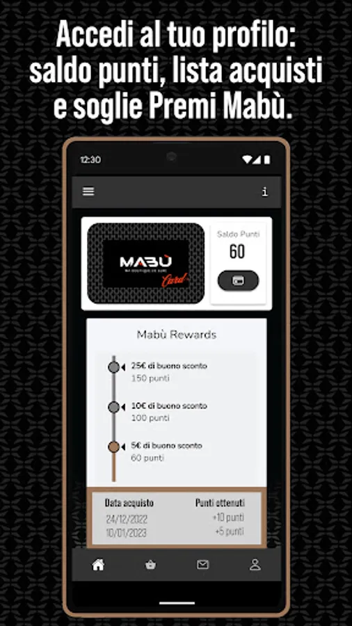 You will be able to consult the information on your latest purchases, your points balance and also use the digital version of your Mabù Card.