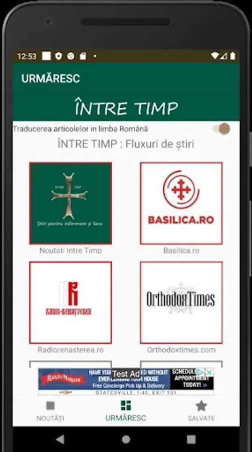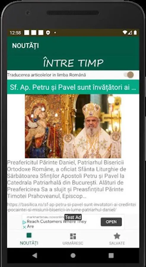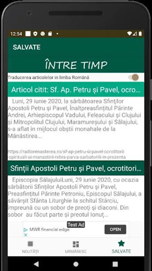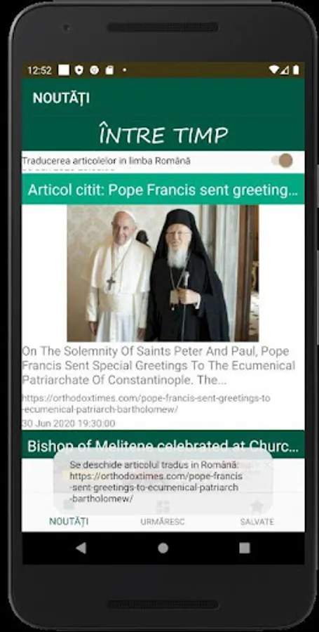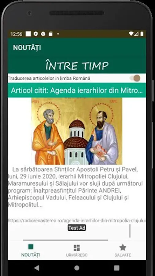 The "Between Time" application works as a news aggregator, with topics mainly from the Orthodox world and, in general, from the Christian world. I felt it as a necessity in the middle of a climate imbued with confusion, with adherence to ill-will and, I say it without malice, even ignorance. The user can choose from the palette of sites included in the "Watch" menu. The "News" section delivers news according to active sources, with a predetermined recurrence in the software architecture. Many of the news are not written in Romanian but the user can choose to translate them by simply pressing a button and can save their favorite articles. The user can listen to the included radios.
