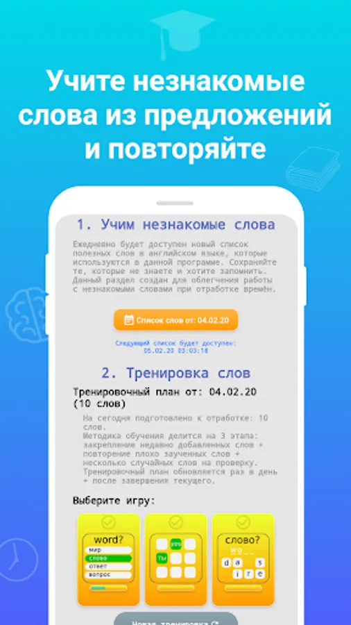 The quality of teaching words is controlled by an artificial intelligence system. Everything that the teacher can forget or not make out, nothing will be hidden from the gaze of the machine. It will draw the smallest gaps from the further depths of your knowledge: a system of interval repetitions, the identification of forgotten words, a cycle of residual knowledge.